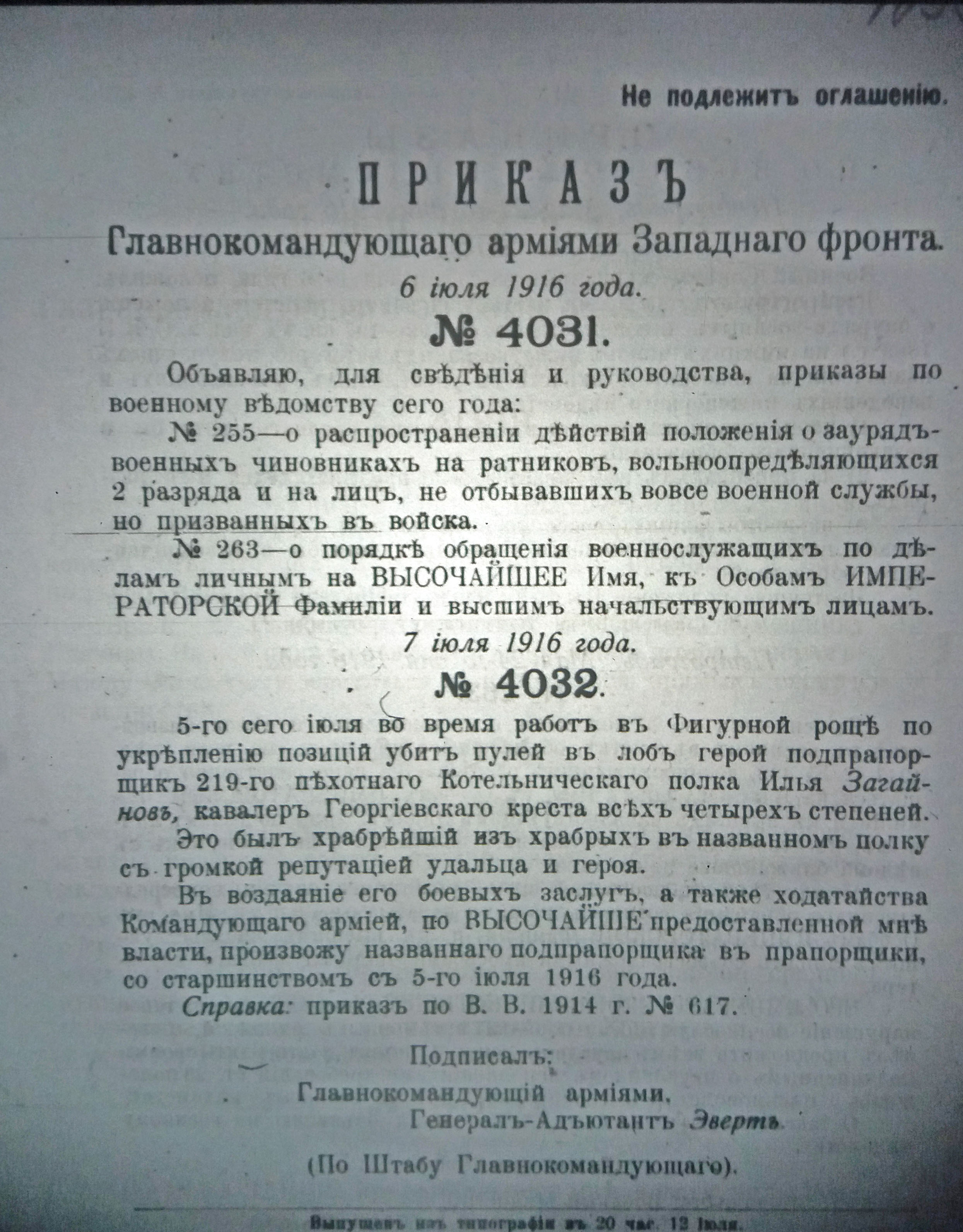 Высочайше предоставленной мне властью убитый подпрапорщик 219 пехотного Котельничского полка Илья Загайнов произведён мною сего числа за боевые отличия в прапорщики со старшинством со дня смерти 5 июля».