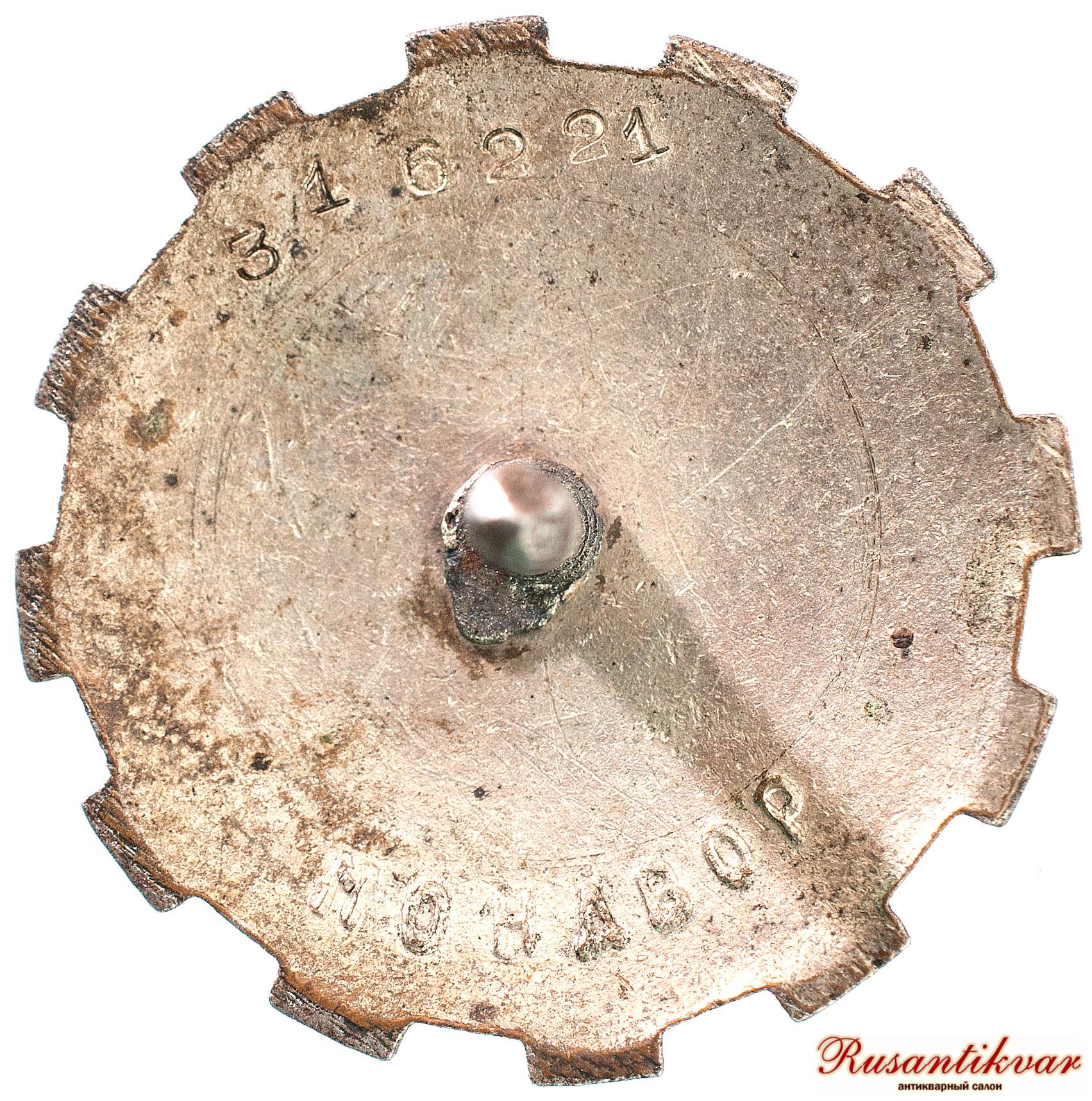 Знак 1924 год, Мастерская Академии Художеств, клейма на лицевой стороне знака вверху справа: Ленинградского окружного пробирного управления в овальном щитке [альфа, женская головка в кокошнике, вправо, 84], круглый знак удостоверения и клеймо мастерской «М / АХ» в треугольном щитке, серебро вес 9,51 гр. размер 28,5х27,5 мм.