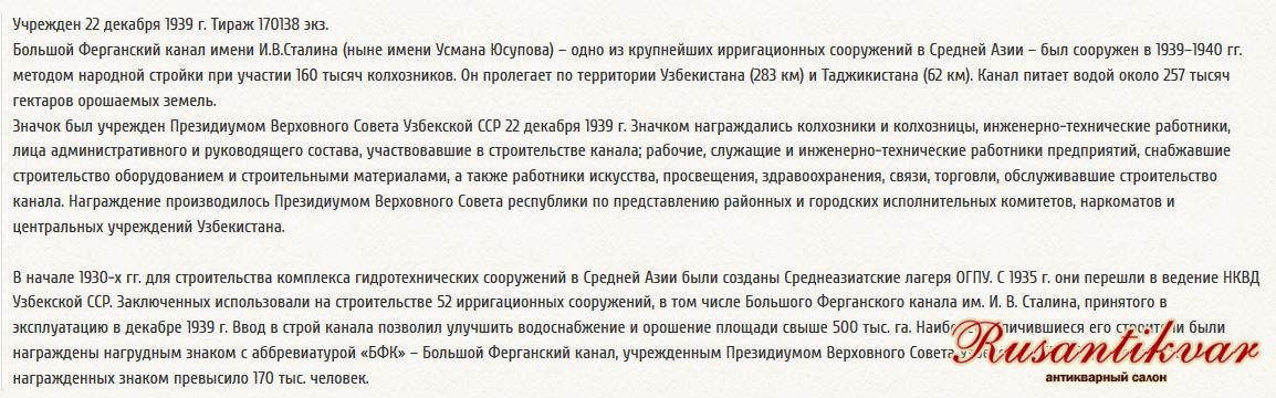 Знак «Участнику строительства Большого Ферганского канала имени тов. Сталина в Узбекской ССР».