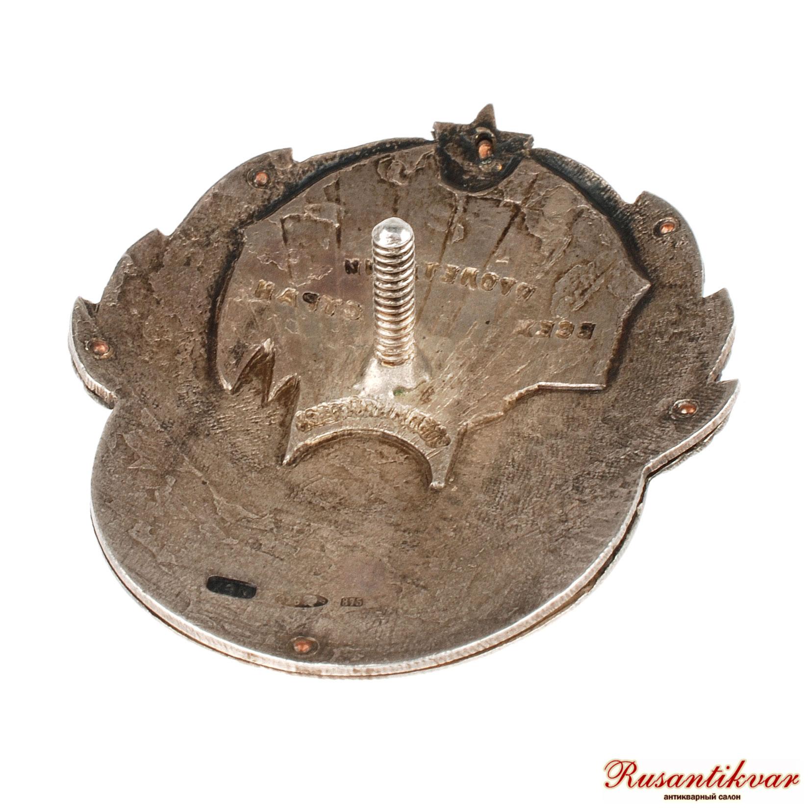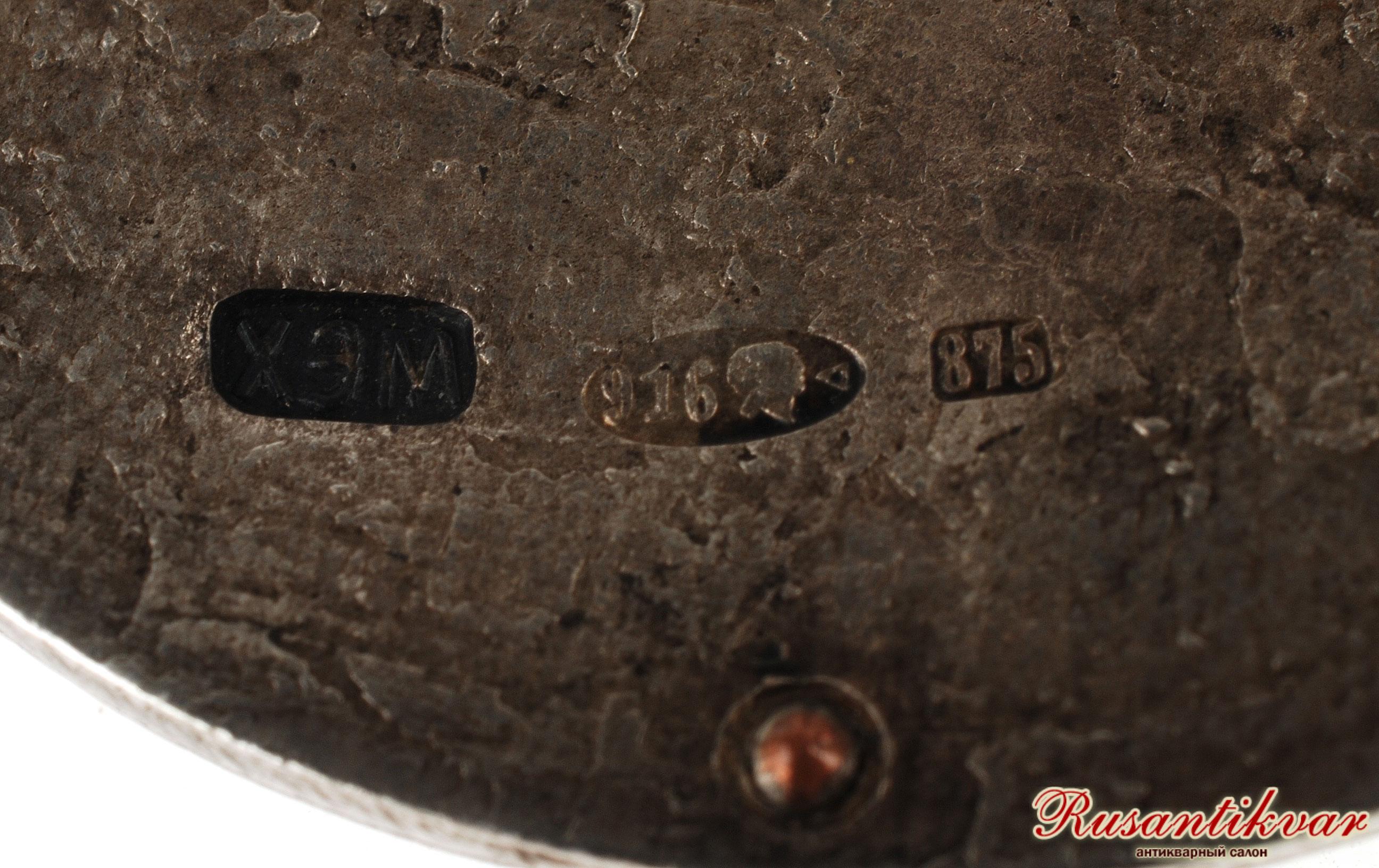 Мастерская «ХЭМ». Клейма на оборотной стороне знака внизу: Московского окружного пробирного управления с пробой металла в овальном щитке [916, голова рабочего вправо, дельта], проба металла «875» и клеймо мастерской «ХЭМ».