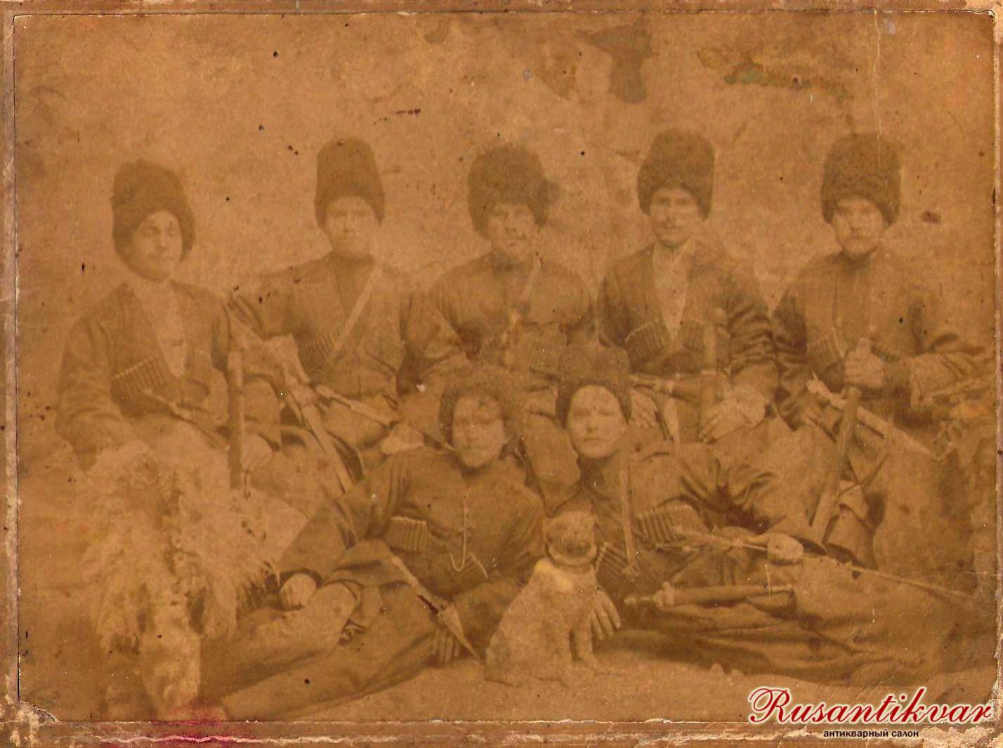 В белой черкеске второй справа сидит казак Гражданкин.Первый справа стоит казак Каменев.Станица Новомарьевская.