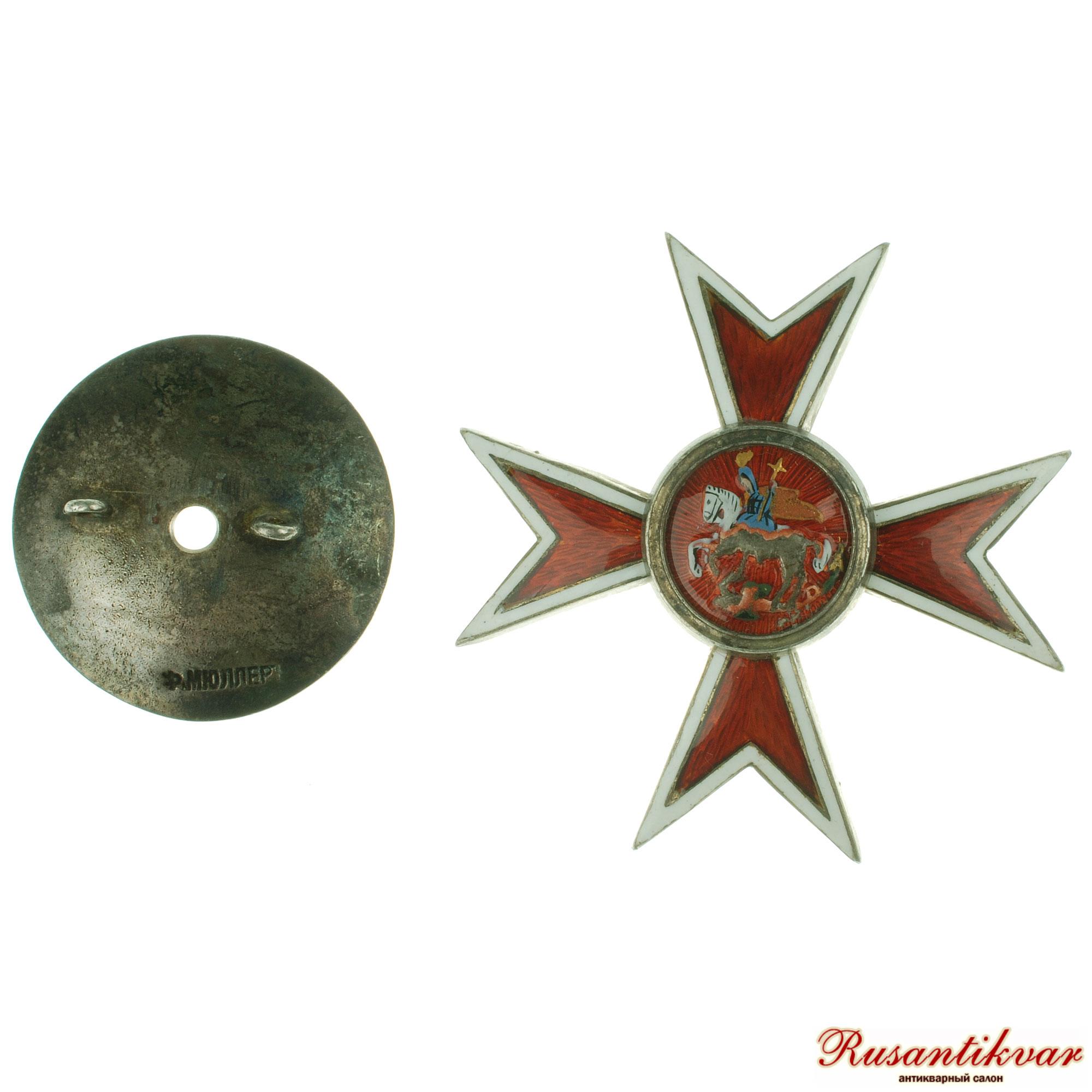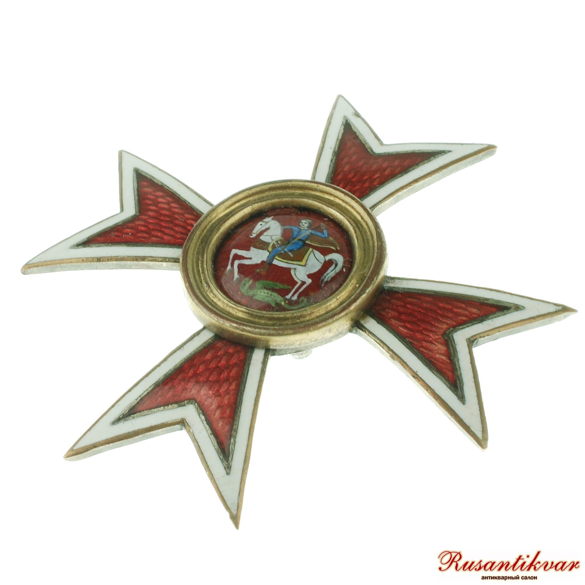 Утвержден 4 октября 1913 года. Мальтийский крест красной эмали с белым ободком. В середине его красный эмалевый кружок с золотым ободком, а на нём белая фигура св. Георгия Победоносца.