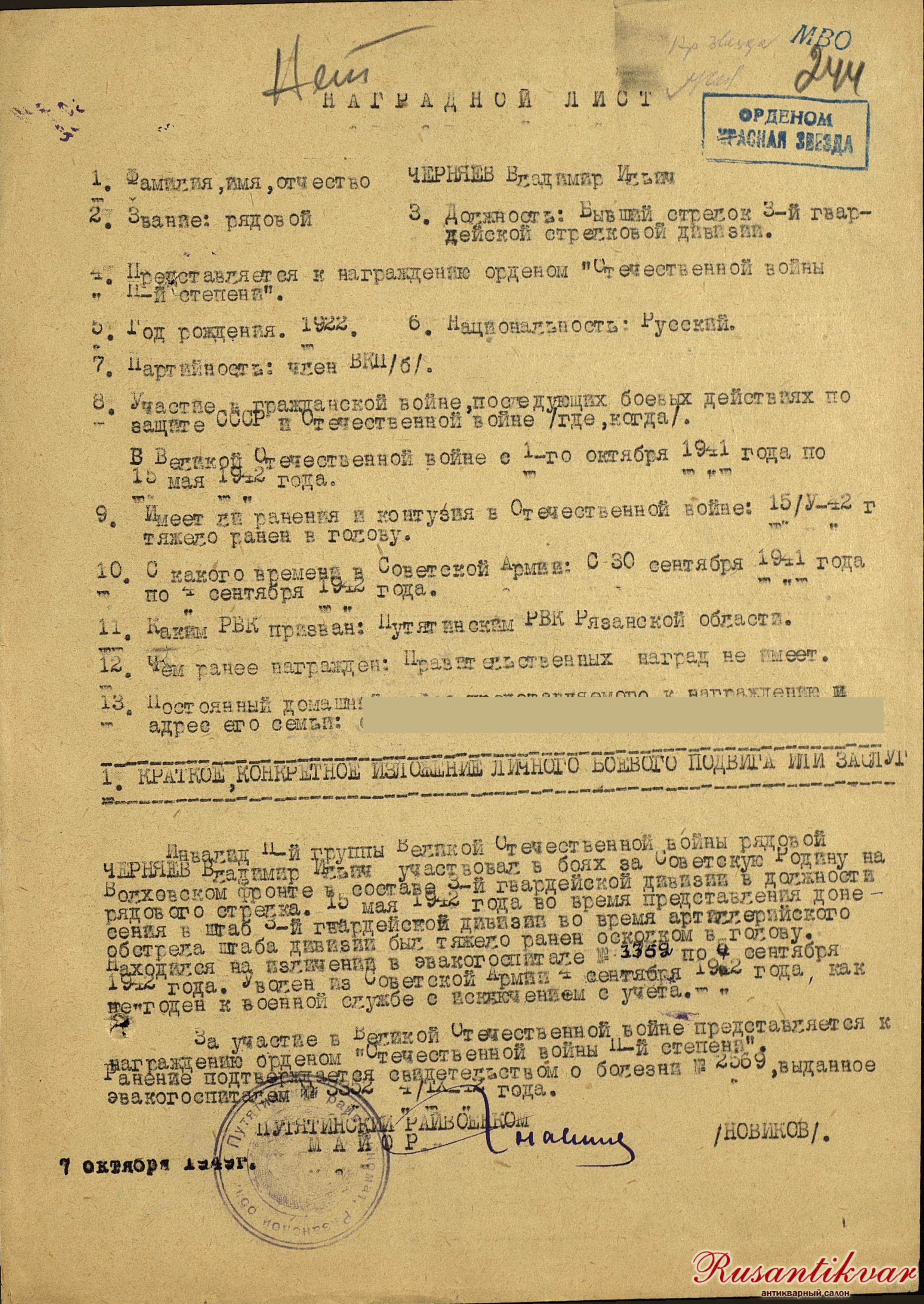 Наградной лист.
