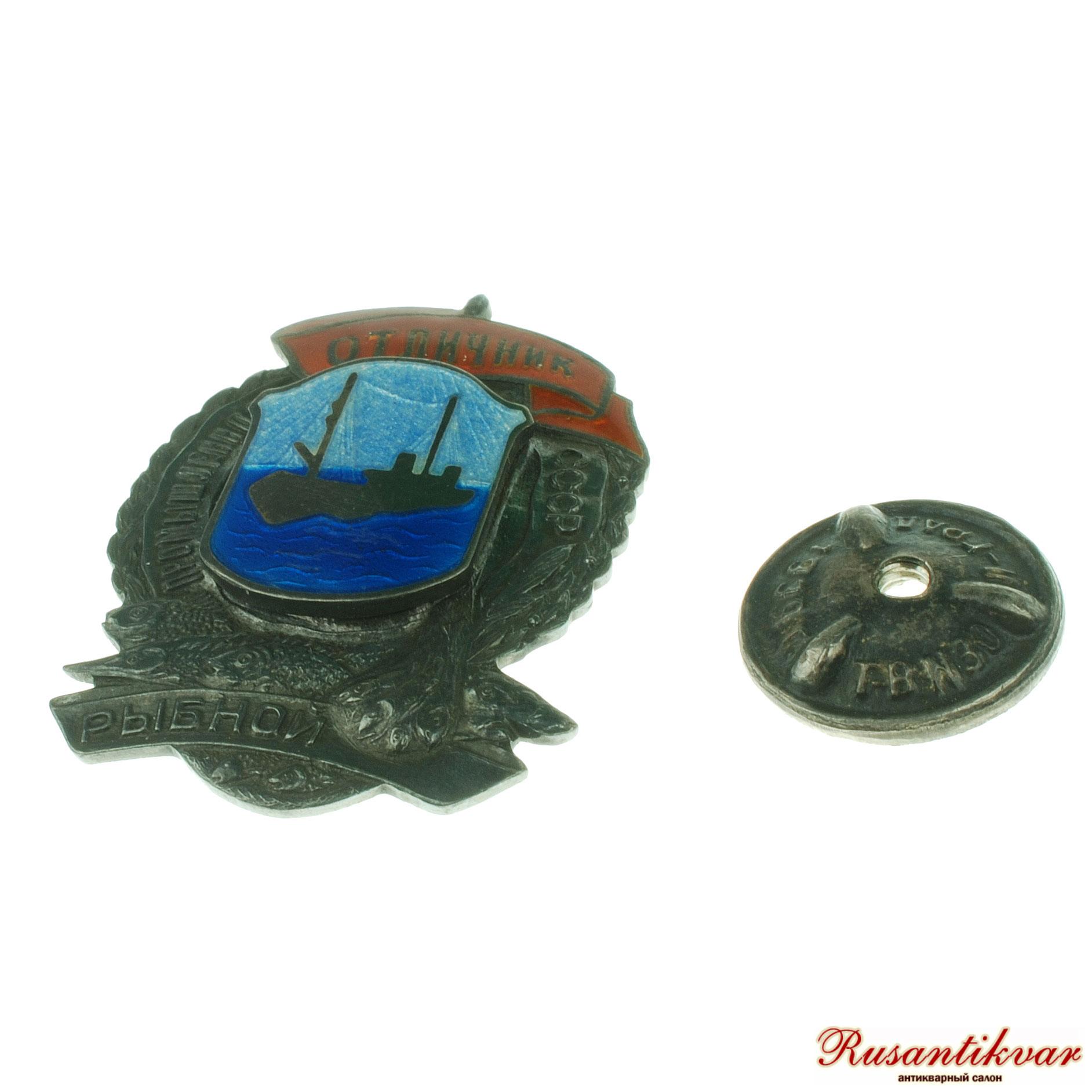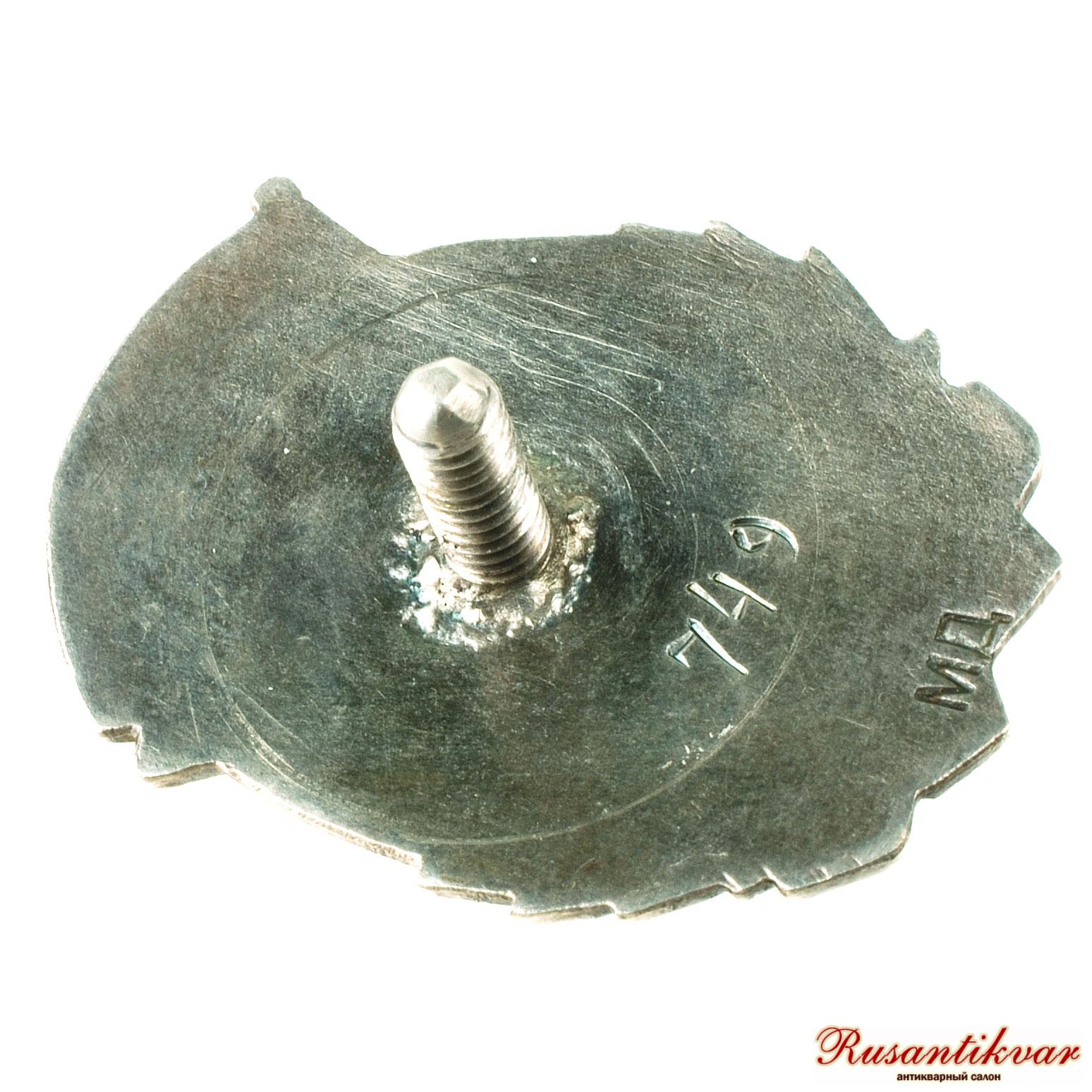 Знак «Отличник социалистического соревнования Наркомрыбпрома СССР», № 749 СССР, ЛМД, 1940 г. На об. ст. значка внизу выбито: «МД». На гайке вверху по окружности надпись: «МОНДВОР».