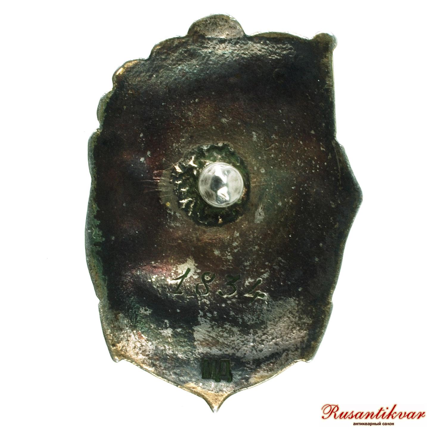 Значок «Отличник социалистического соревнования Наркомречфлота» № 1834. СССР Значок «Отличник социалистического соревнования Наркомречфлота» № 4834. СССР, Ленинградский монетный двор, начало 1940-х гг. На оборотной стороне значка внизу выбито: «МД». На гайке в верхней части по окружности надпись: «МОНДВОР». Серебро, позолота, эмаль, 8,87 г. Размеры 28,8 х 20,1 мм. Сохранность отличная. Ведомственные знаки отличия# 1.234.1. Доценко# 96. Нагрудные знаки СССР. С. 215. На оборотной стороне значка под винтом вырезан номер: «4834». Довольно редкий.