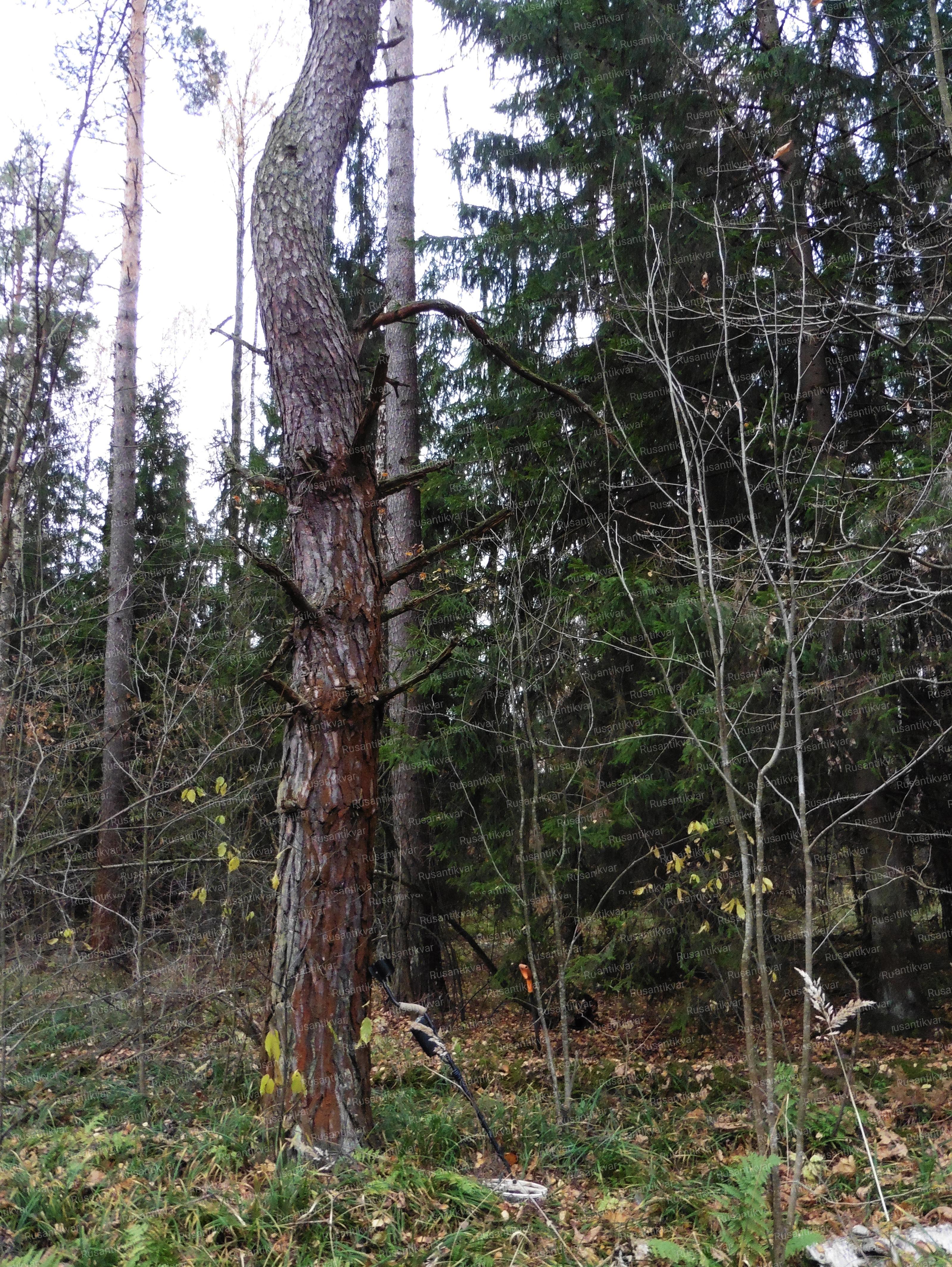 Ознакомившись с этими материалами, мы решили найти место, куда упал второй мотор бомбардировщика. В 110-120 метрах к востоку от нашего раскопа заметили неглубокую воронку. Прибор показал наличие металла - в дёрне были найдены обломки мотора М-105. Раскопки самой воронки показали, что её глубина 1.2 метра, мотор извлечён в далеком прошлом, а обломков в ней осталось не много. Совпадение или нет, но в метре от воронки растет старая сосна, возраст которой не менее 80 лет. Её ствол искривлён – вероятно, это следствие повреждения дерева падающим мотором 77 лет назад.