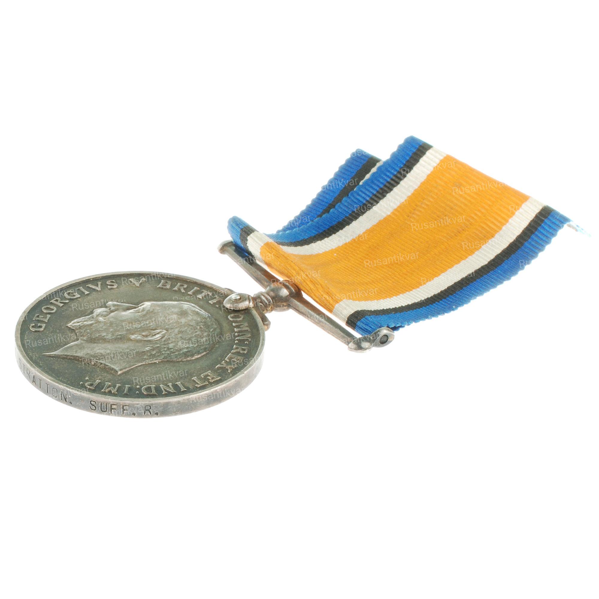 Военная британская медаль (английский язык; British War Medal) «За участие в войне 1914-1918 гг.». Великобритания. Британская империя. Медаль учреждена 26 июля 1919 года, королем Великобритании Георгом V (1910 – 1936 гг.). Награждались британские военнослужащие за участие в I Мировой войне (28 июля 1914 – 11 ноября 1918 гг.). Выпуск 1919-1920 гг.