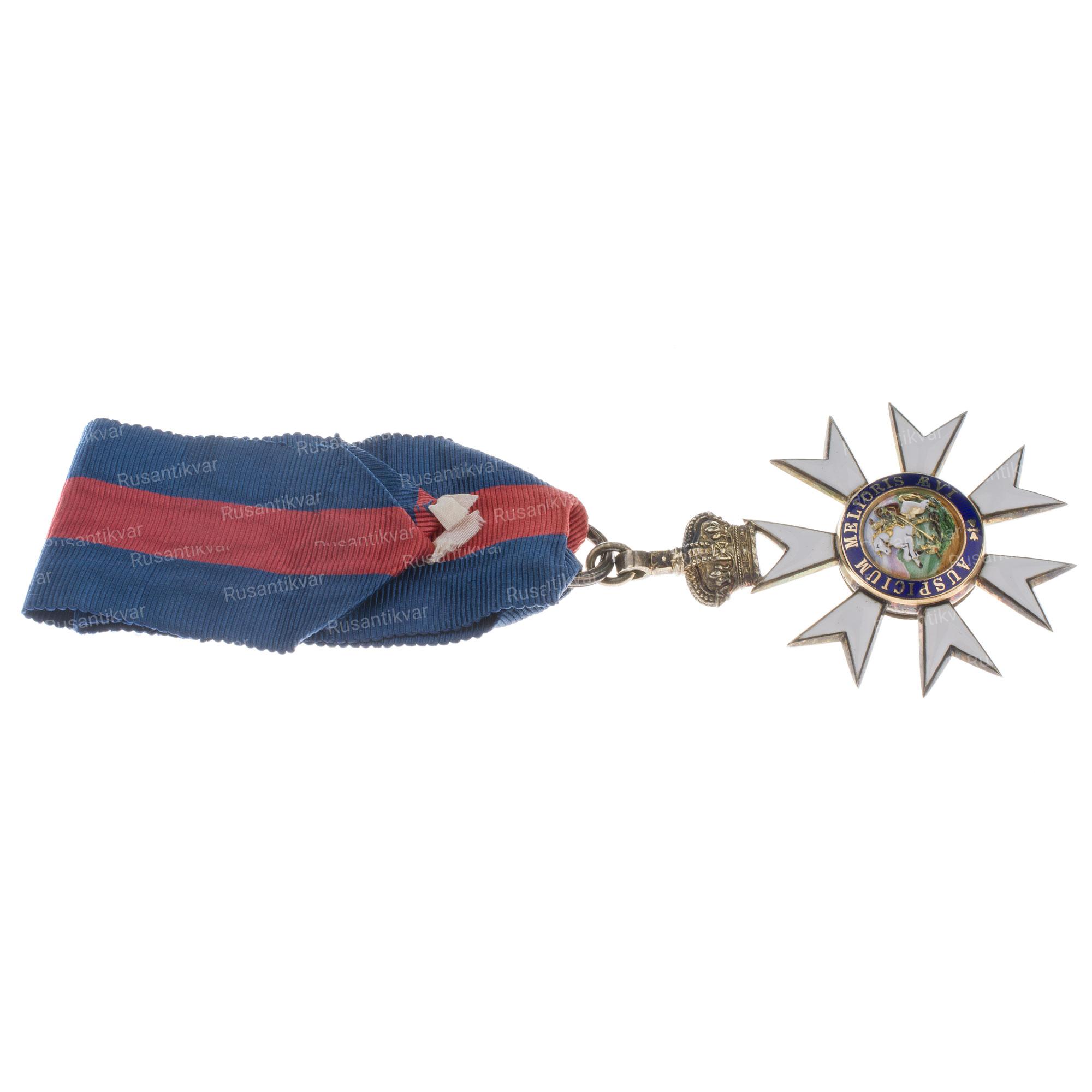 Соединенное королевство Великобритании и Ирландии. Знак ордена Св. Михаила и Св. Георгия, на орденской ленте. Начало XX в. Неизвестная мастерская. Без клейм. Золото, серебро, позолота, эмаль, 27,57 г; шелк (муар). Размеры 64,8 x 47,3 мм. Сохранность отличная.