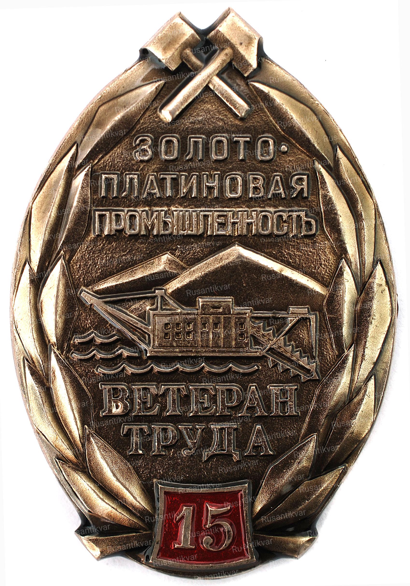 Знак "Ветеран труда золото-платиновая промышленность. 15 лет трудового стажа."