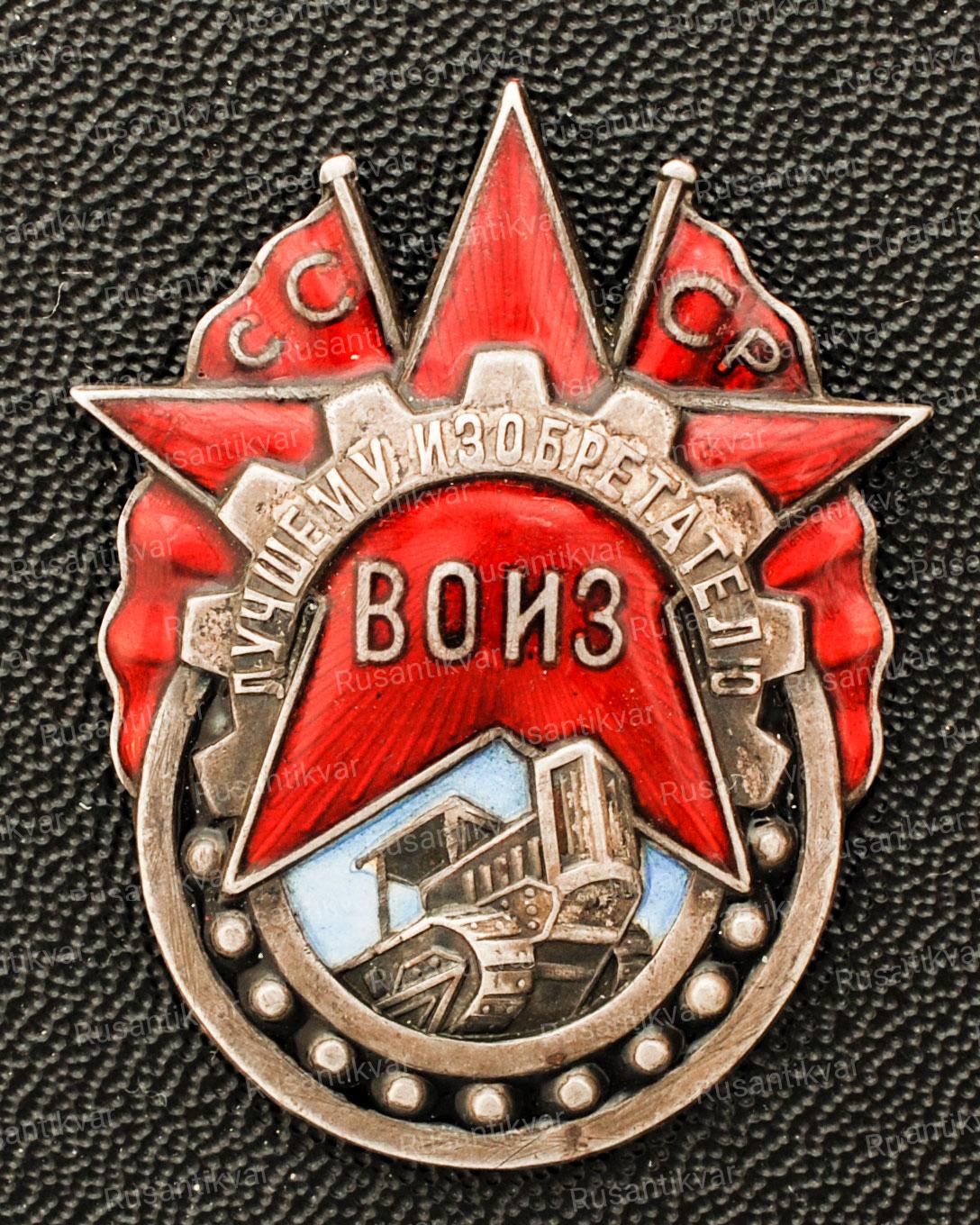 серебро, эмаль, винт Всесоюзное общество изобретателей и рационализаторов (ВОИЗ) организованно в марте 1930 г., призванное объединить творческие усилия изобретателей и рационализаторов. Для поощрения наиболее отличившихся общество выпустило знак «Лучшему изобретателю ВОИЗ СССР». Распущено в 1938 г.