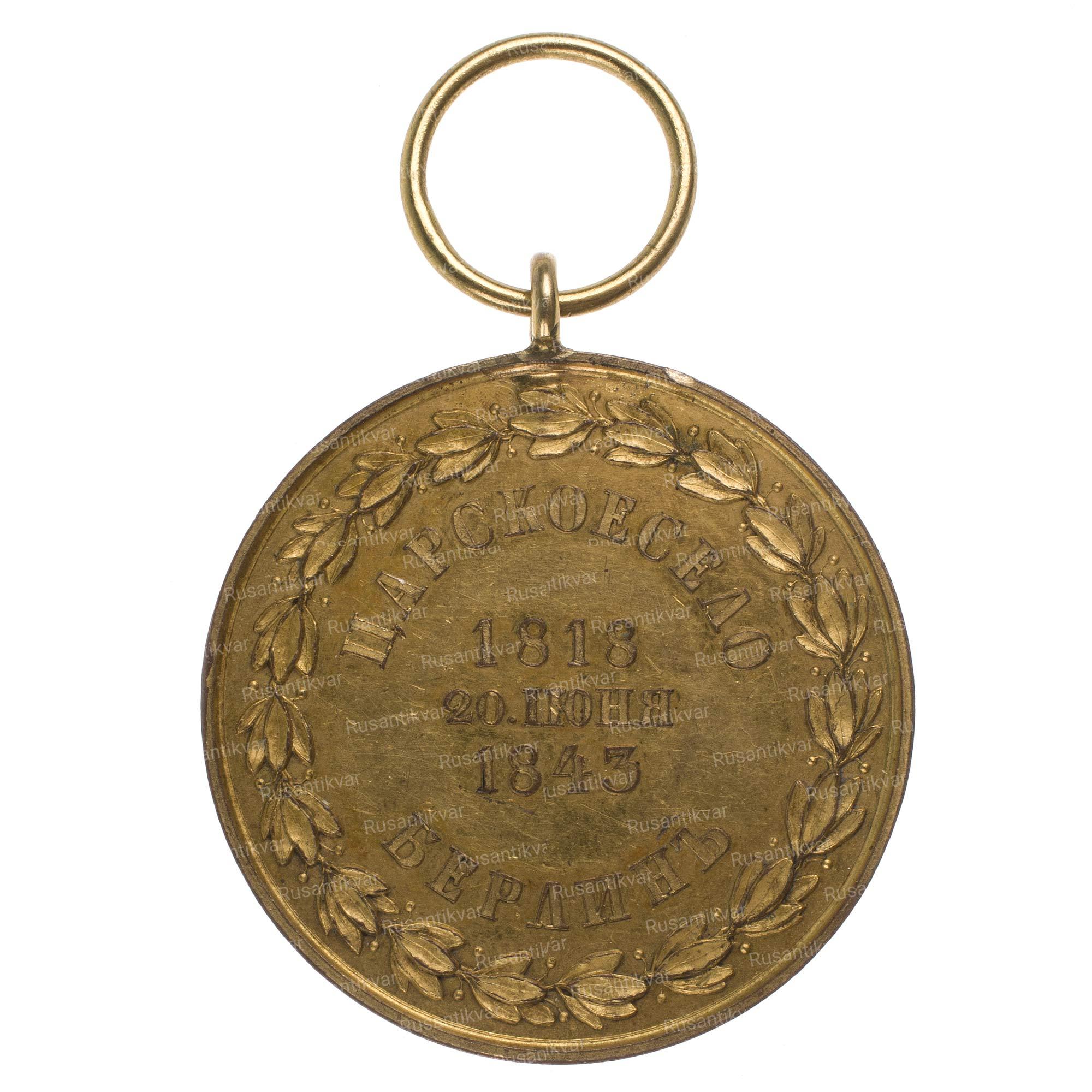 Медаль в память 25-летия со дня назначения короля Фридриха Вильгельма IV шефом Гренадерского Его Величества короля Прусского полка. Королевство Пруссия, Берлинский королевский монетный двор, 1843 г. Медальер К.К.Пфойффер (без подписи). Бронза, позолота, 17,30 г. Диаметр 33,3 мм. Сохранность отличная. Дьяков# 570.1 (R1). Биткин# 1199 ®. Лозовский Е.В. История одного заблуждения // С.-Петербургский коллекционер. 2006. № 5 (40). С. 24–25. Тираж 3224 экз.