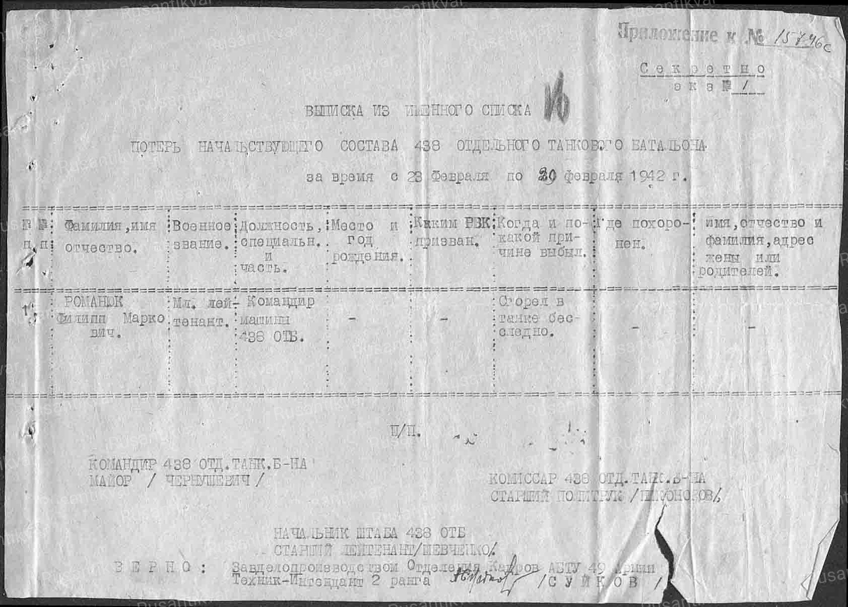 3. Выписка о потерях начальствующего состава 438 ОТБ с 23 по 29 февраля 1942 года. В выписке его записали, как РОмАнюк. В другом списке о потерях он указан как РАмОнюк.