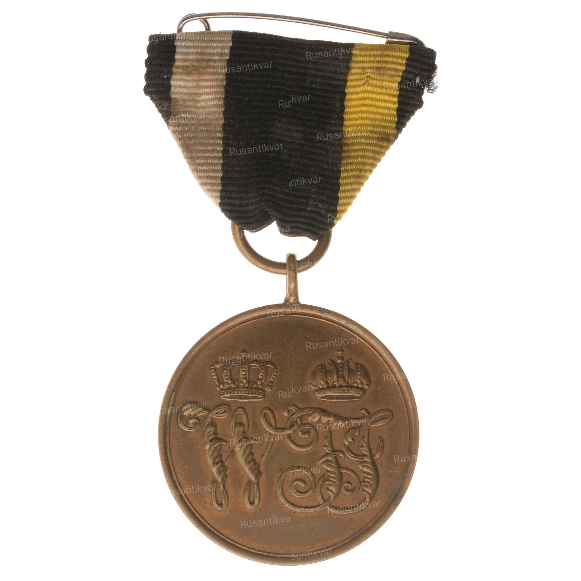 Военная медаль в память подавления революционного восстания в Пруссии, Саксонии и Бадене войсками прусского короля Фридрих Вильгельм IV (1840 — 1861 гг.) 1848-1849 гг. (памятная медаль Гогенцоллернов). Учреждена 23 августа 1851 года. Королевство Пруссия, Германия. Производственный выпуск берлинского монетного двора.