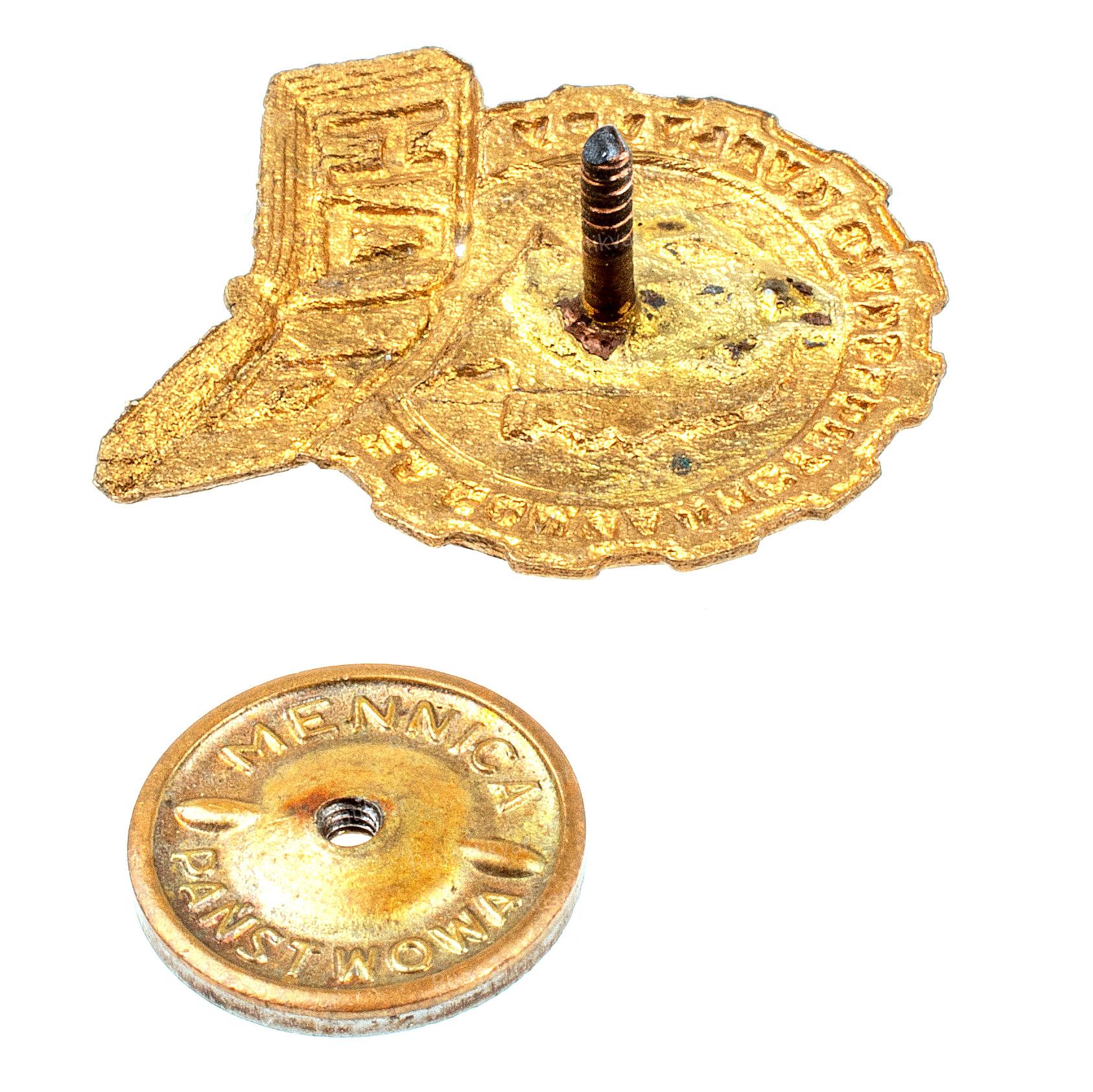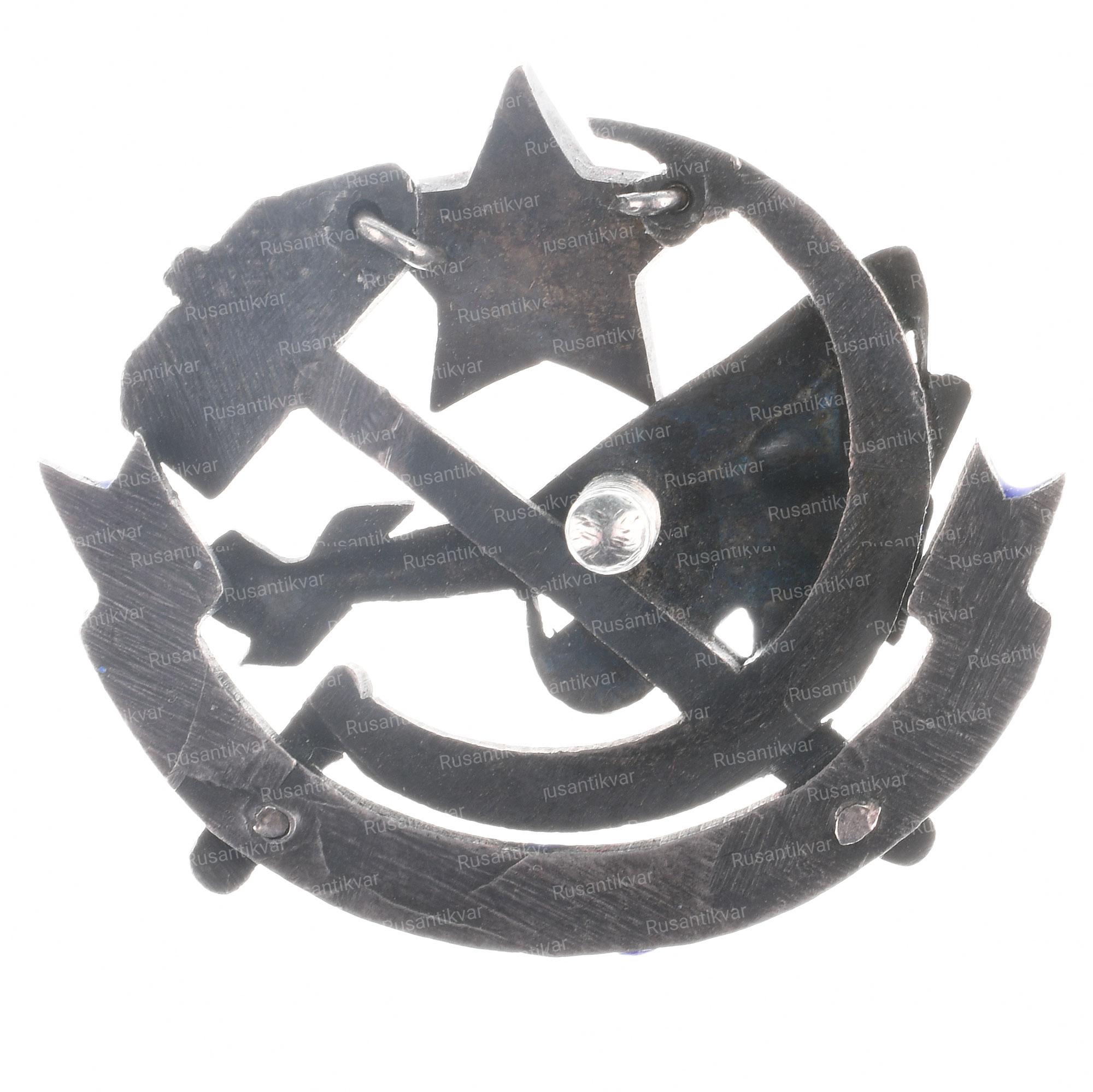 Москва, Московское товарищество художников, 1940 - 1941 гг. Серебро, позолота, эмаль, 7,3 гр. Размеры 30,5х24,8 мм. Клеймо на обратной стороне "МТХ" и вырезан номер "6 - 18.253". На гайке надпись "МОНЕТНЫЙ ДВОР". Сохранность отличная (UNC). Знаки добровольных обществ СССР № 3.32.