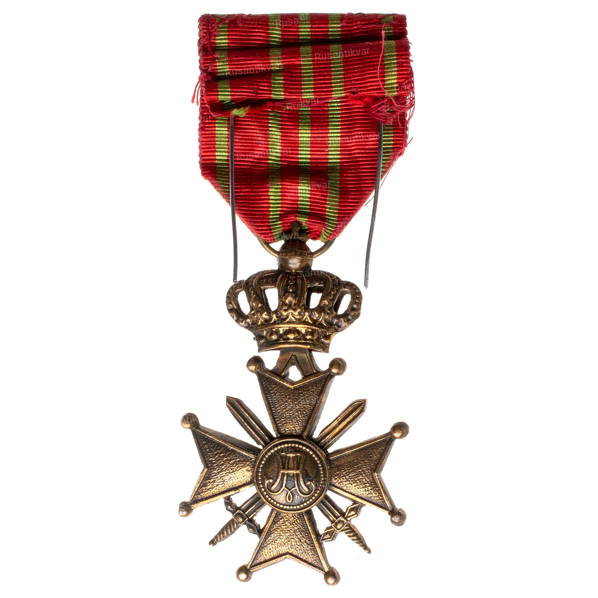 «Огненный крест». Учрежден 6 февраля 1934 года. Бельгия. Награждались ветераны Бельгийской армии пережившее артиллерийские обстрелы во время «Окопной войны» периода I Мировой войны (1914-1918 гг.) Реверс: изображение лавровой ветви, королевской короны в обрамление лучей небесного света, даты 1914-1918 гг., надпись на латинском языке SALUS PATRIAE SUPREMA LEX (БЛАГО НАРОДА — ВЫСШИЙ ЗАКОН), маркировка мастера — медальера A. ROMBAUT.