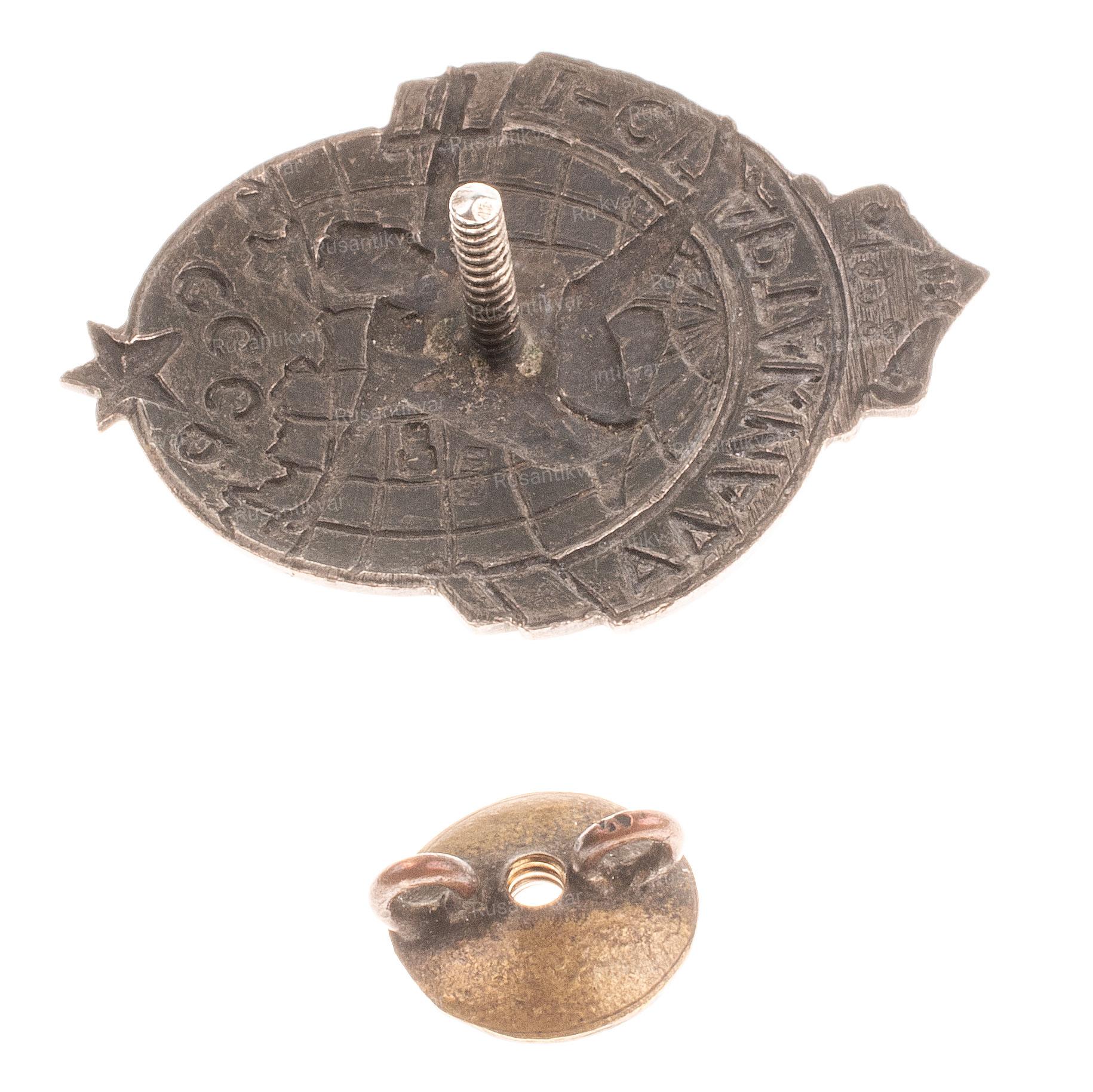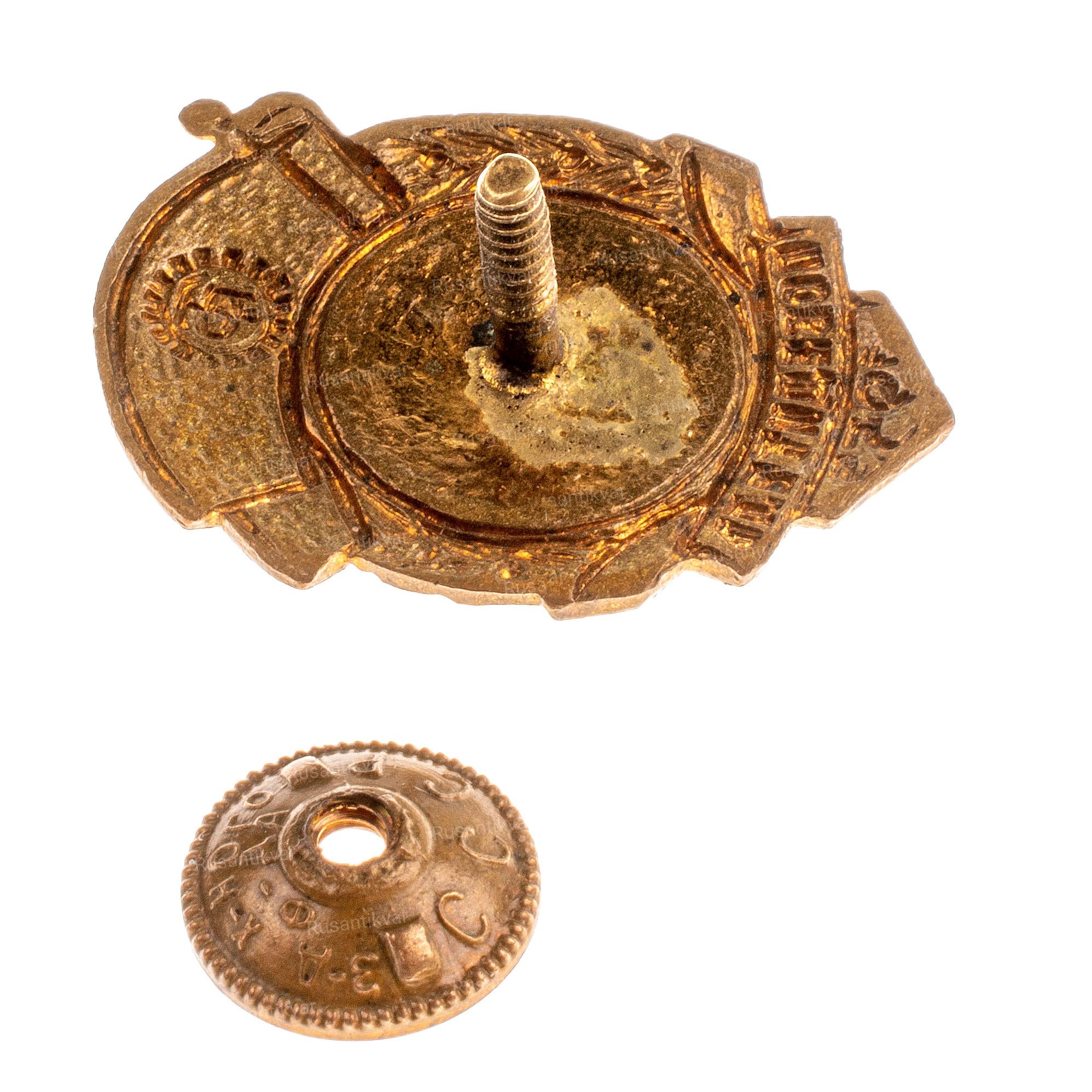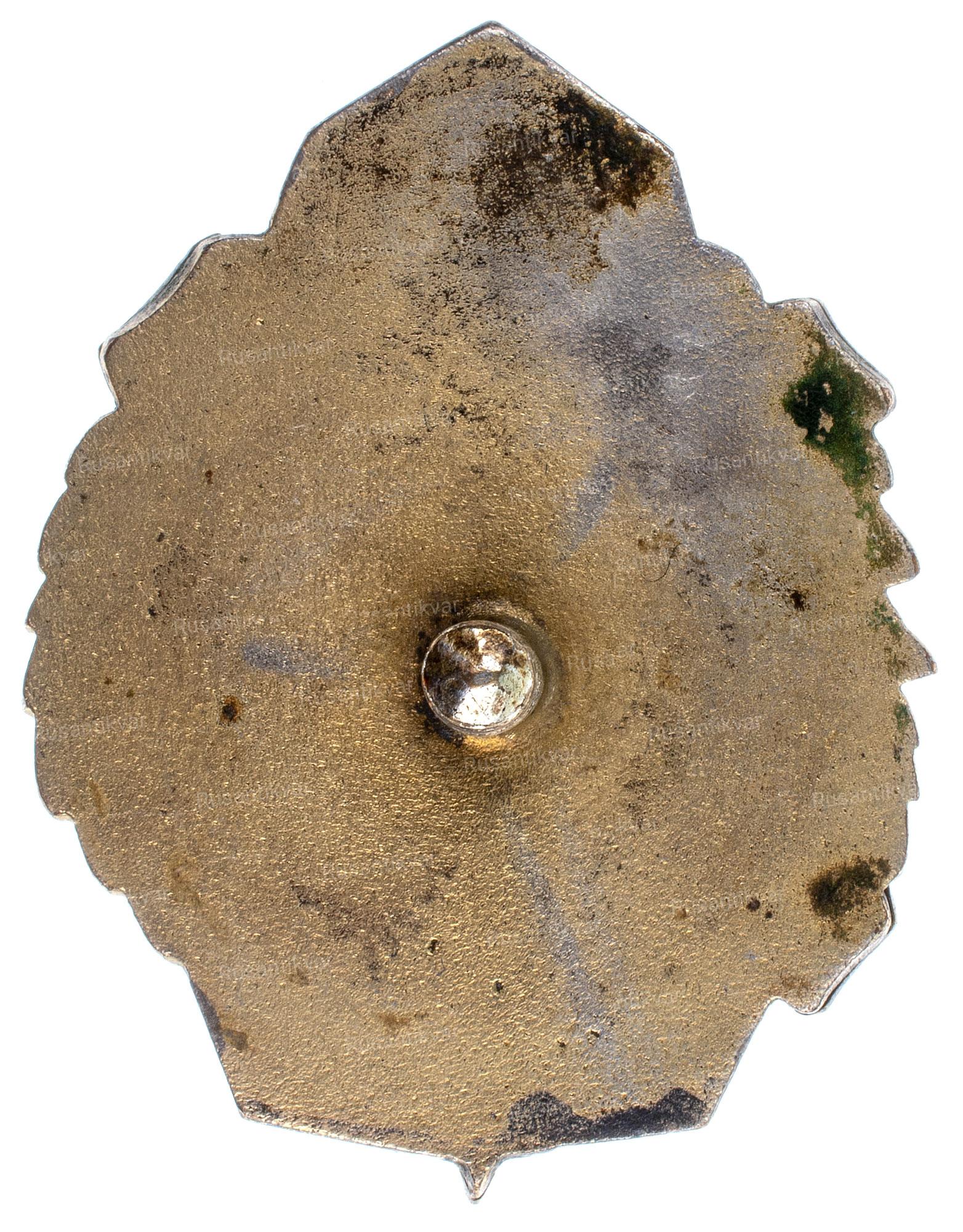 Знак победителя первенства СССР среди сельской молодежи, 1946 г. Москва, 1946 г. Завод «Победа». Бронза, серебрение, позолота; эмаль; 19,62 г. Размеры 36,8×28,2 мм. На гайке — надписи по окружности: вверху — «з-д Победа», внизу — «МОСКВА». Сохранность отличная. Сысолятин# 1.111.