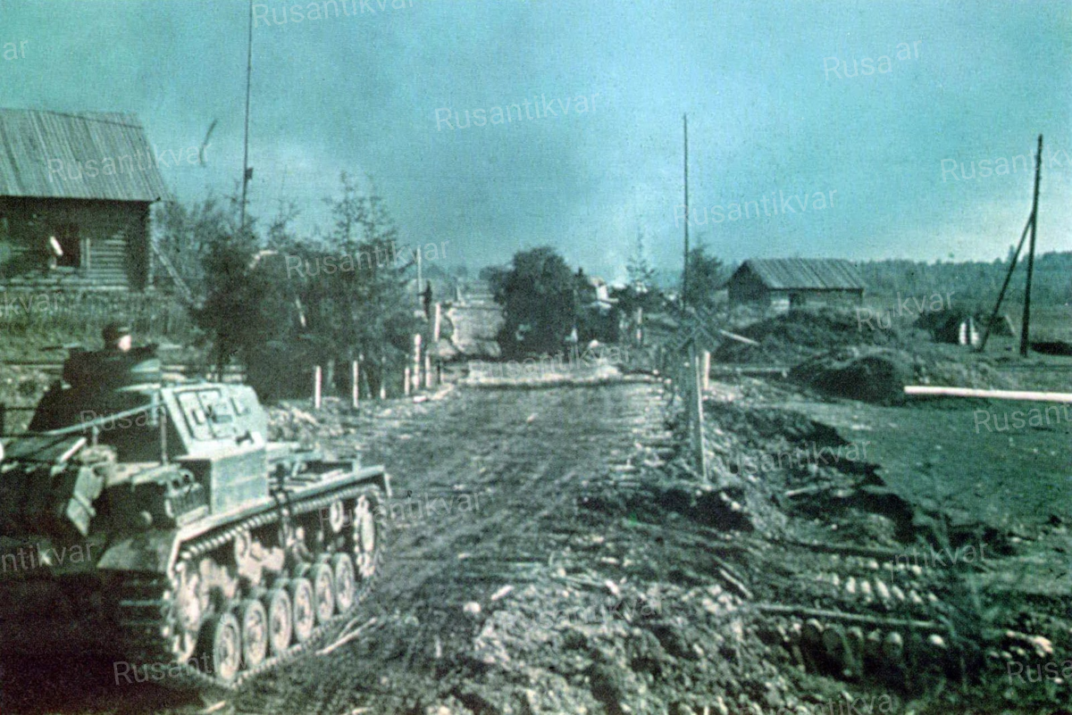 5. Немецкий танк в деревне под Вязьмой. Осень 1941.