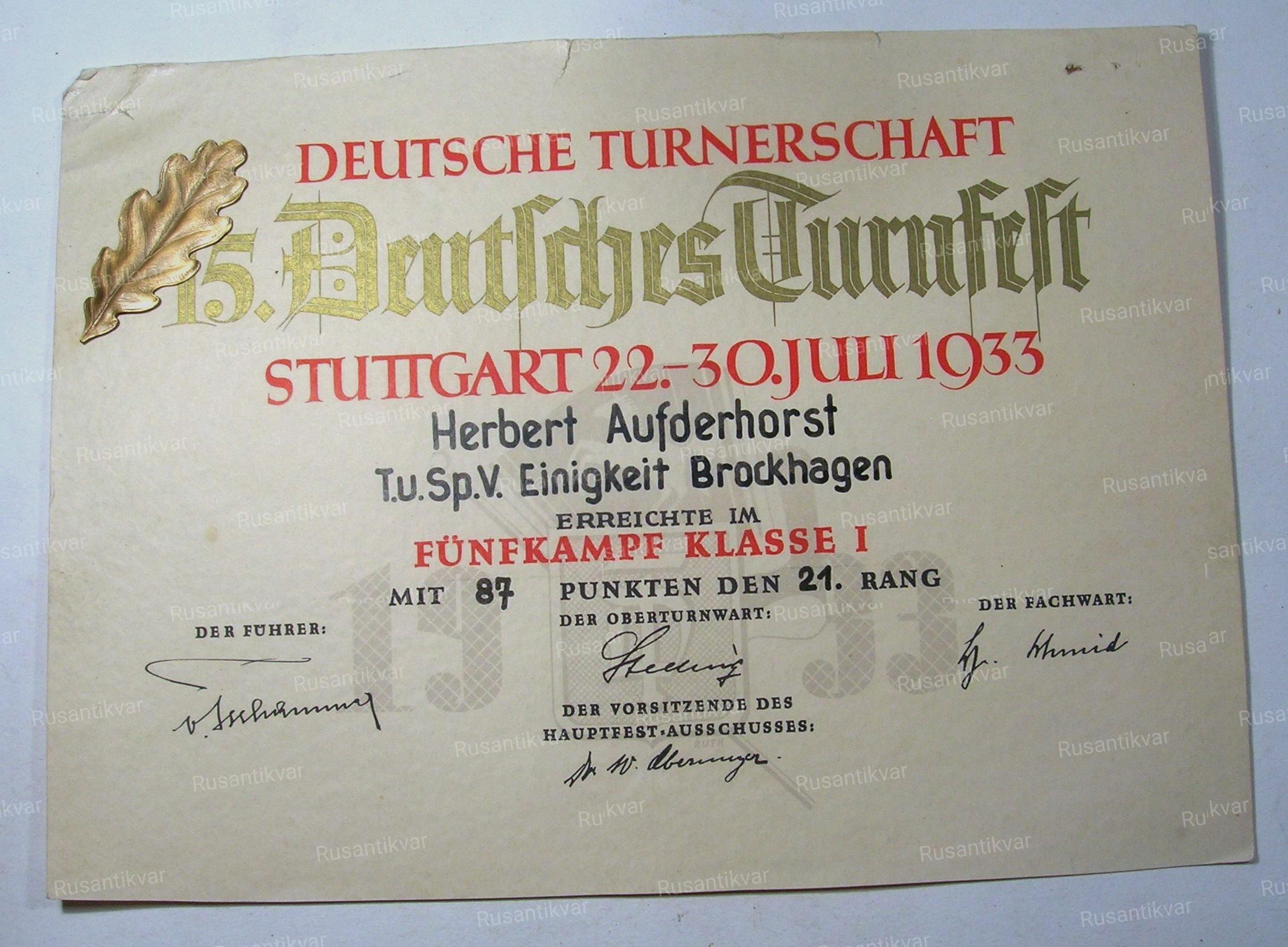 Гимнастический союз, две спортивные грамоты с дубовыми листками на одного человека. Пятиборье. 1930, 1933 гг.