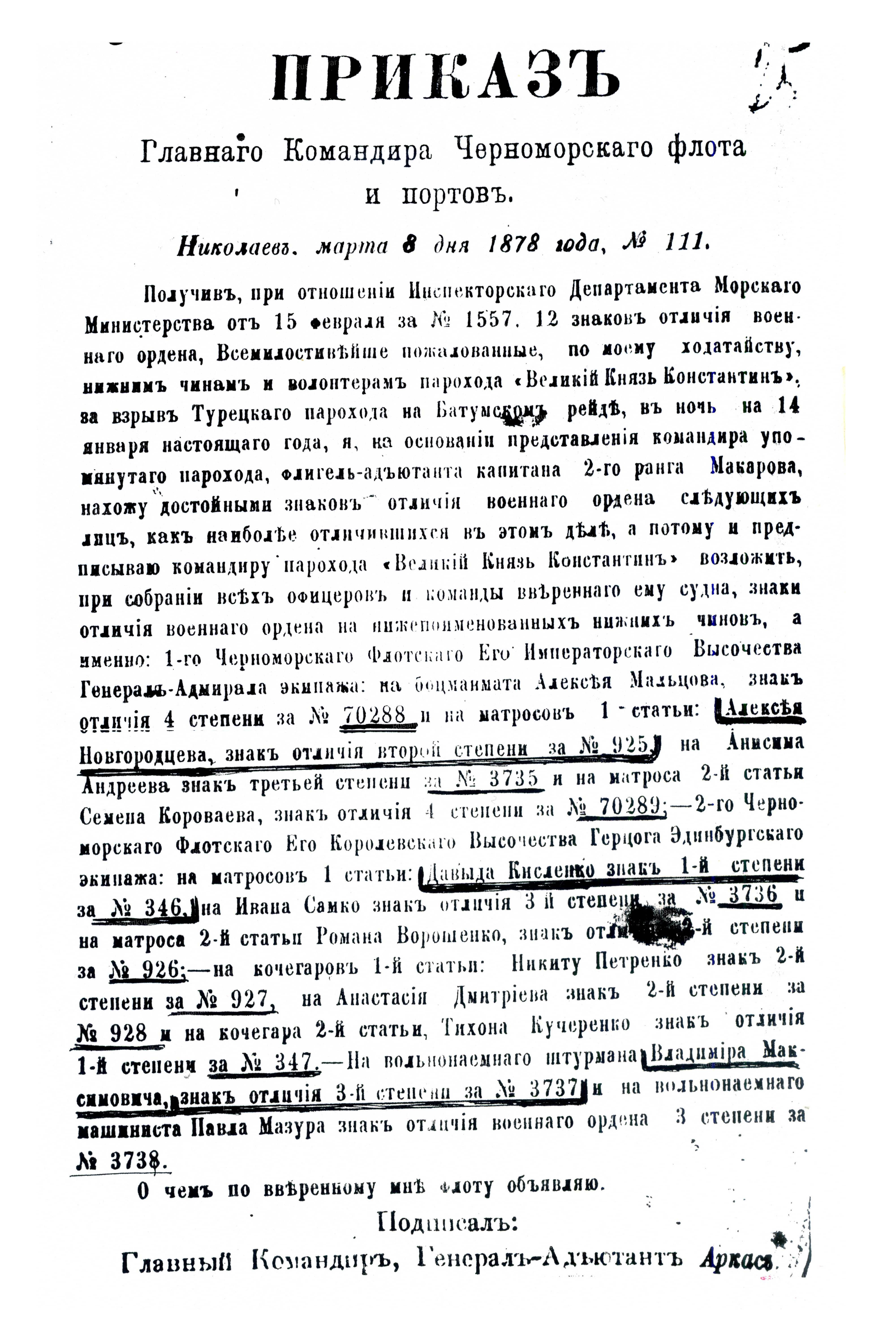 = Награждён за взрыв турецкого парохода на Батумском рейде в ночь на 14 января 1878 г. =