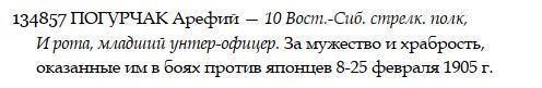 «За бой 4 Iюля 1904 года, за отличiе подъ Ляояномъ въ 1904 году, подъ Мукденомъ въ 1905 году» -