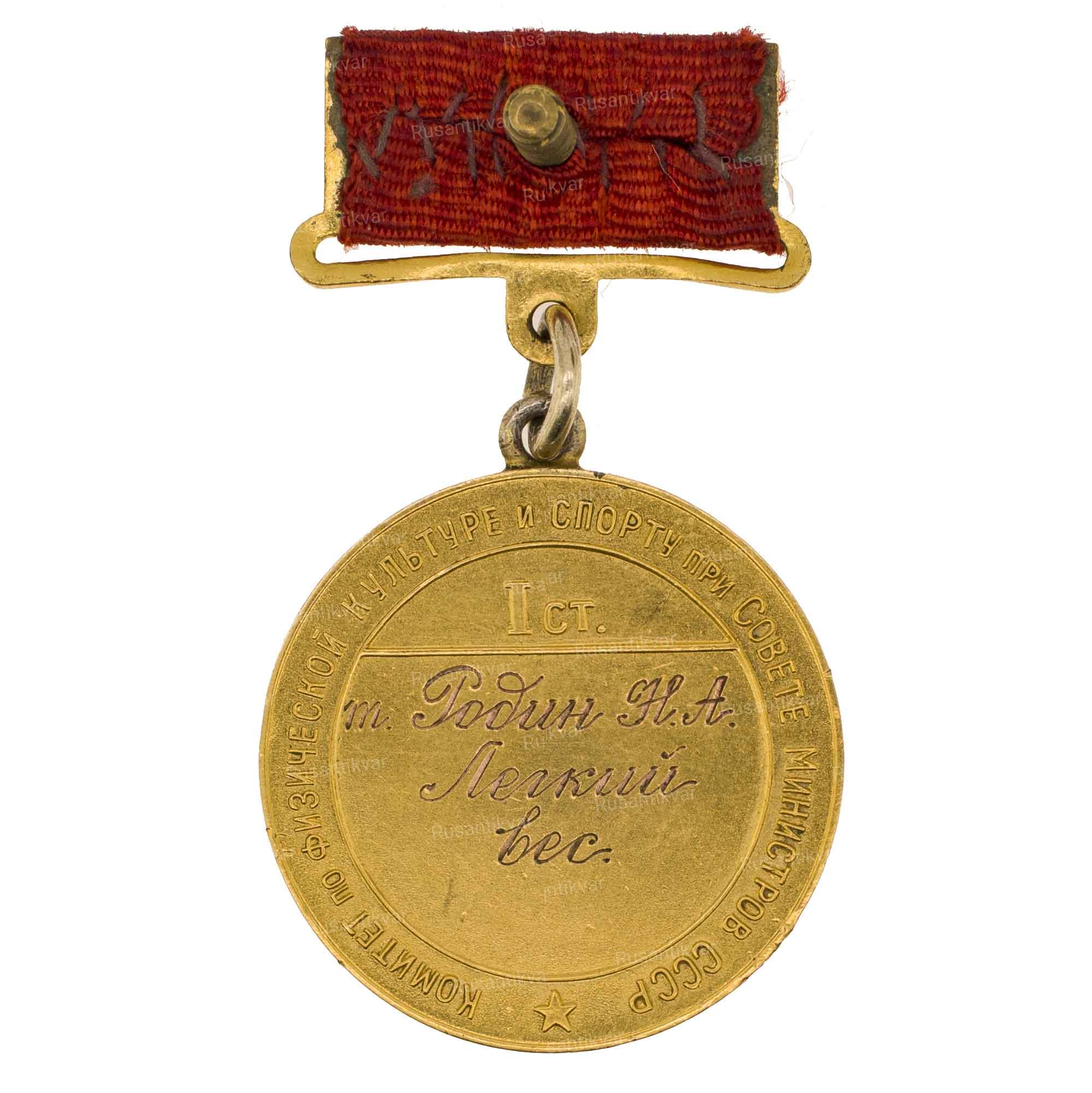 ММД. На гайке надпись по окружности: «МОНЕТНЫЙ / ДВОР». Золото, шелк (муар); 15,34 г. Диаметр 28 мм. На шильдике лиц. ст. — дата «1957». На об. ст. медали выгравировано : «т.Родин Н.А. / Легкий / вес ». Сохранность почти отличная, лента потерта. Редкая.