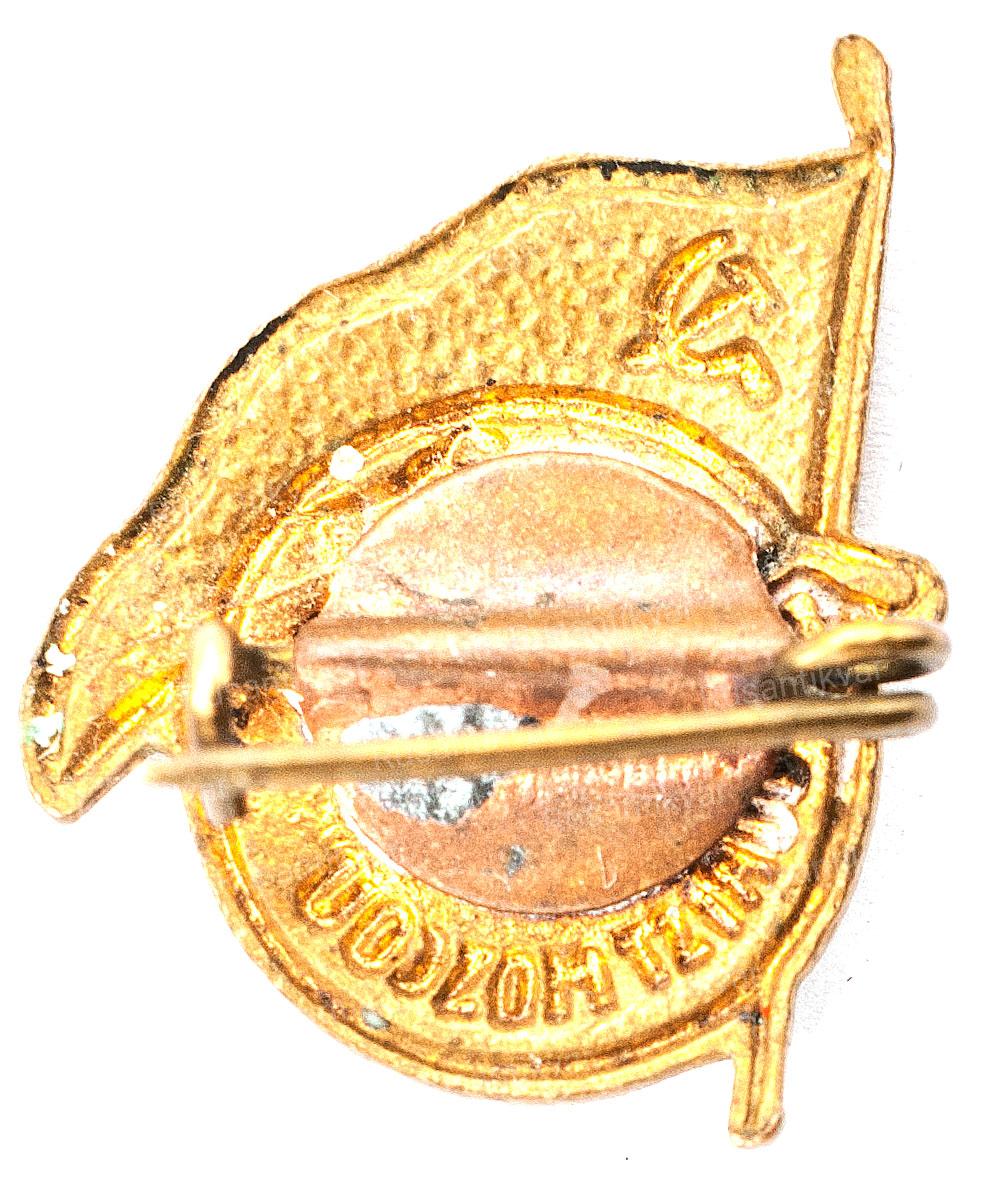 Знак в память 50-летия Главных Ленинских мастерских СКОПС, № 66. СССР, 1924 г. Неизвестная мастерская. Без клейм. Серебро, эмаль, 20,67 г. Размеры 46,1×34,3 мм. Сохранность очень хорошая, эмаль частично утрачена, красивая патина. На об. ст. знака слева выбит номер: «66». Принадлежал С.Г.Климову. На подложке выгравированы инициалы и фамилия владельца знака: «С.Г.Климов». Очень редкий.