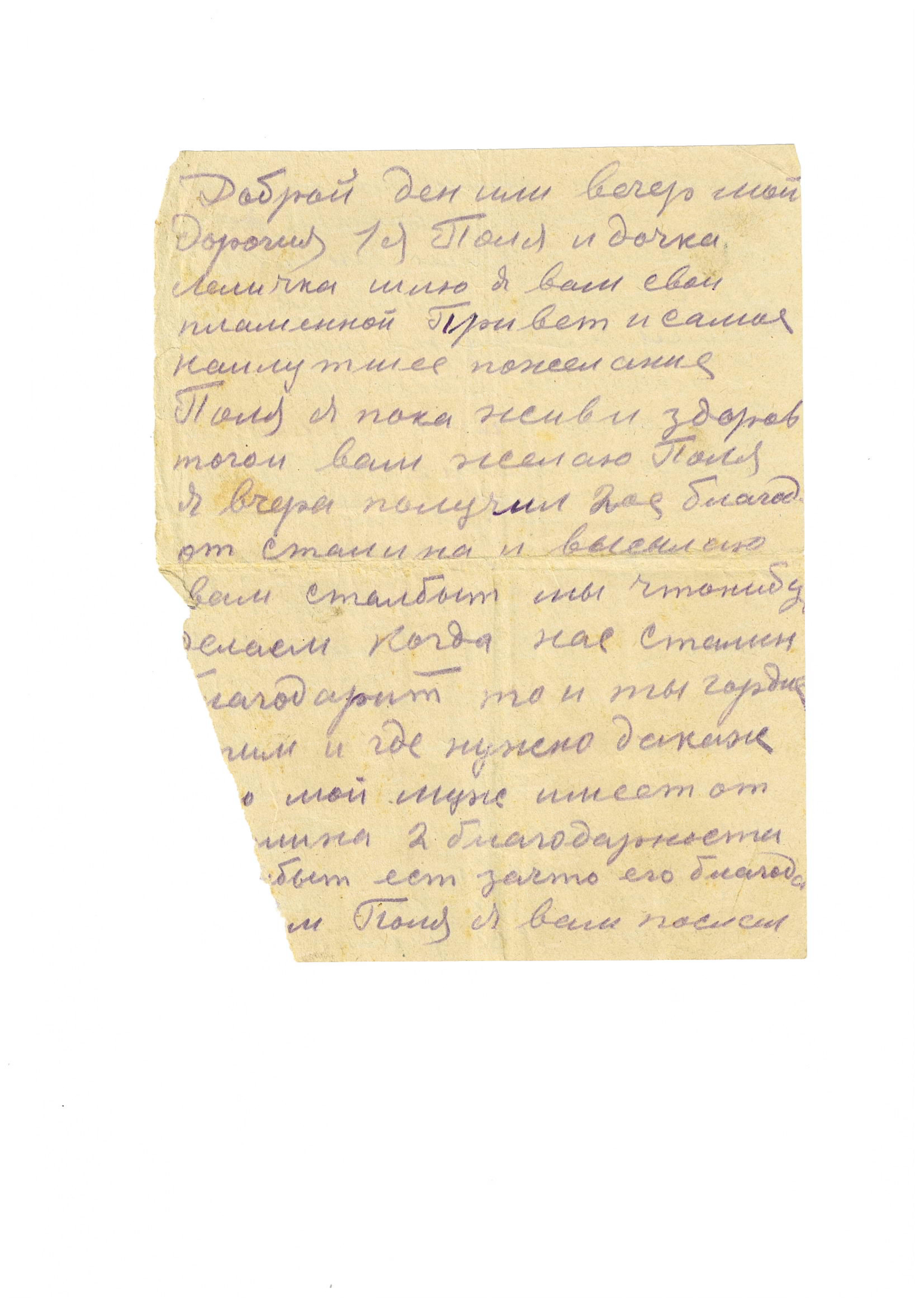 Поля, я вчера получил вторую благодарность от Сталина и высылаю вам, Стало быть мы что-нибудь делаем, когда нас Сталин благодарит. То и ты гордись этим и где нужно докажи, что мой муж имеет от Сталина 2 благодарности и стало бы есть за что его благодарить…Поля, я вам послал 2 посылки. Там в них кое-что, но самое главное дочкам по часам. И если вы их получите, то сообщите мне. Я ещё пошлю, а если не получите, то я больше посылать не буду, а то очень с посылками много канители. Поля, обо мне не думай, я живу хорошо. Хотя и сейчас в новой части, но опять не хуже людей. Поля, а всё же жди меня с победой, домой. Я вернусь и тогда поговорим в душу. Я сейчас имею немецкие офицерские сапоги и брюки. Имею часы серебряные, как что веду культурно. Всё у меня…»
