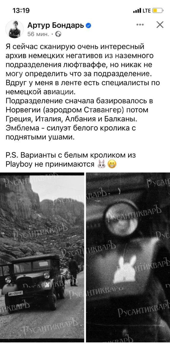 Спросил меня мой старый немецкий друг: " Я сейчас сканирую очень интересный архив немецких негативов из наземного подразделения люфтваффе и никак не могу определить какое именно подразделение оно сначала базировалось на аэродром Ставангер в Норвегии, потом воевало в Западной Европе. Может кто из нас знает к какому подразделению относится тактический знак с белым кроликом. варианты из плейбоя не принимаются.