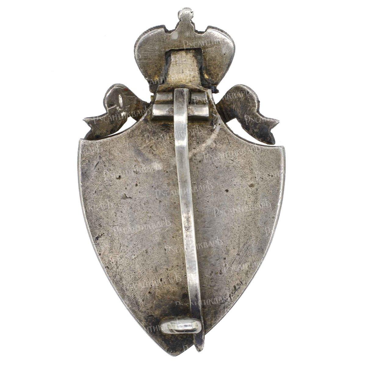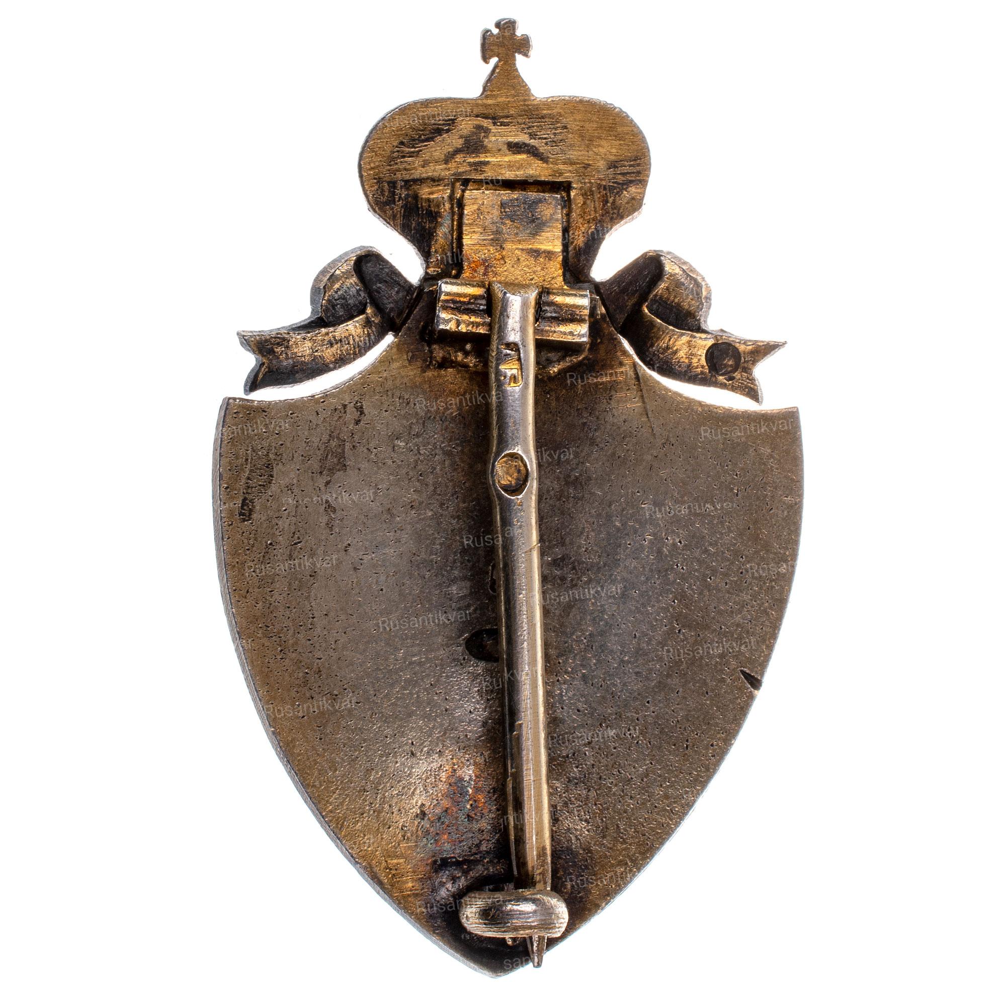 Утвержден 13 марта 1879 г в период царствования Императора Александра II (18 февраля 1855 - 1 марта 1881 гг). Неизвестная мастерская, 80 - е гг XIX в. Серебро, эмаль, 9.3 гр. Размер 46 х 26.2 мм. Без клейм.