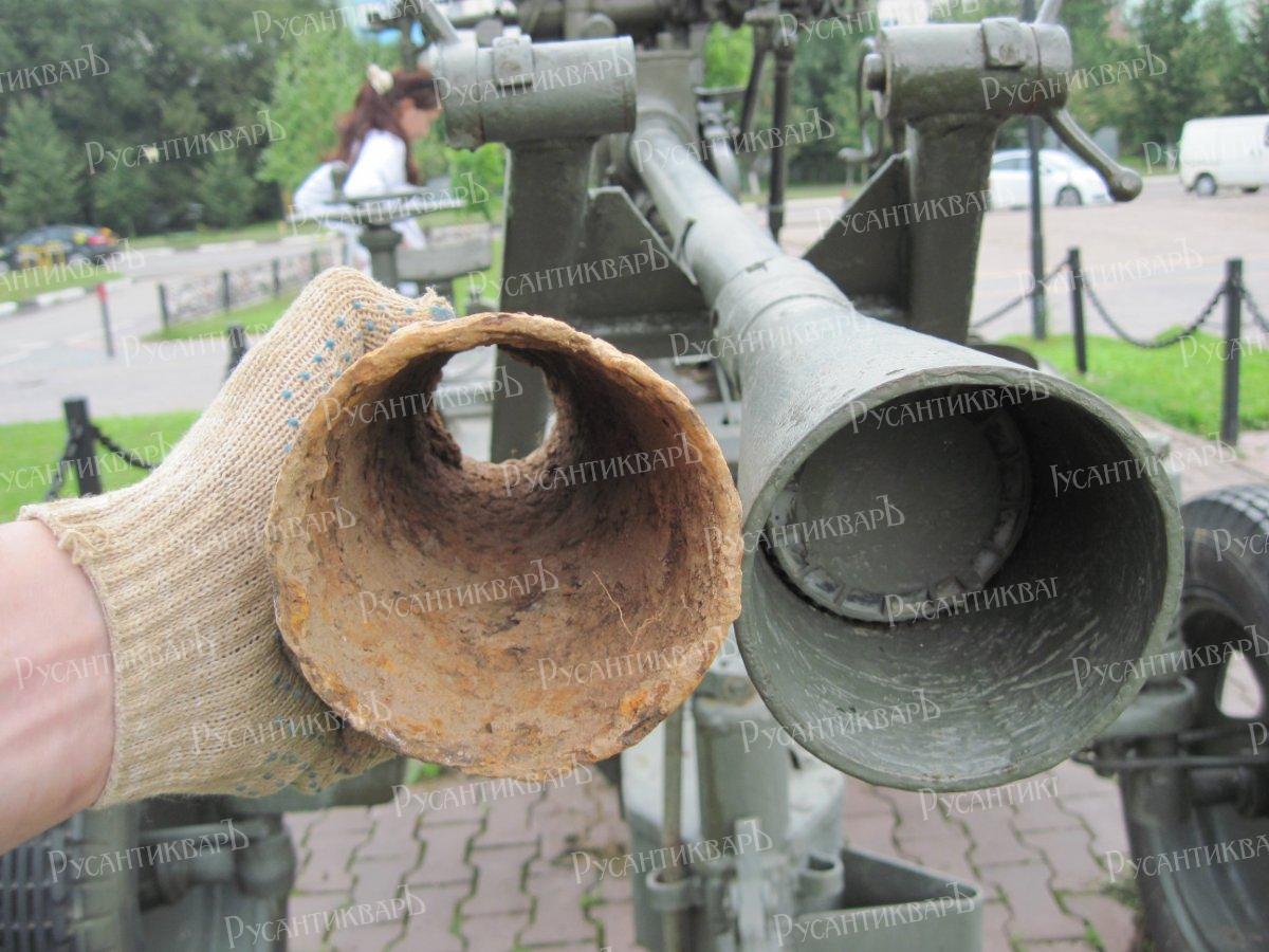 18. Оторванный пламегаситель ствола 37-мм зенитного орудия рядом с целым орудием. Фото автора.