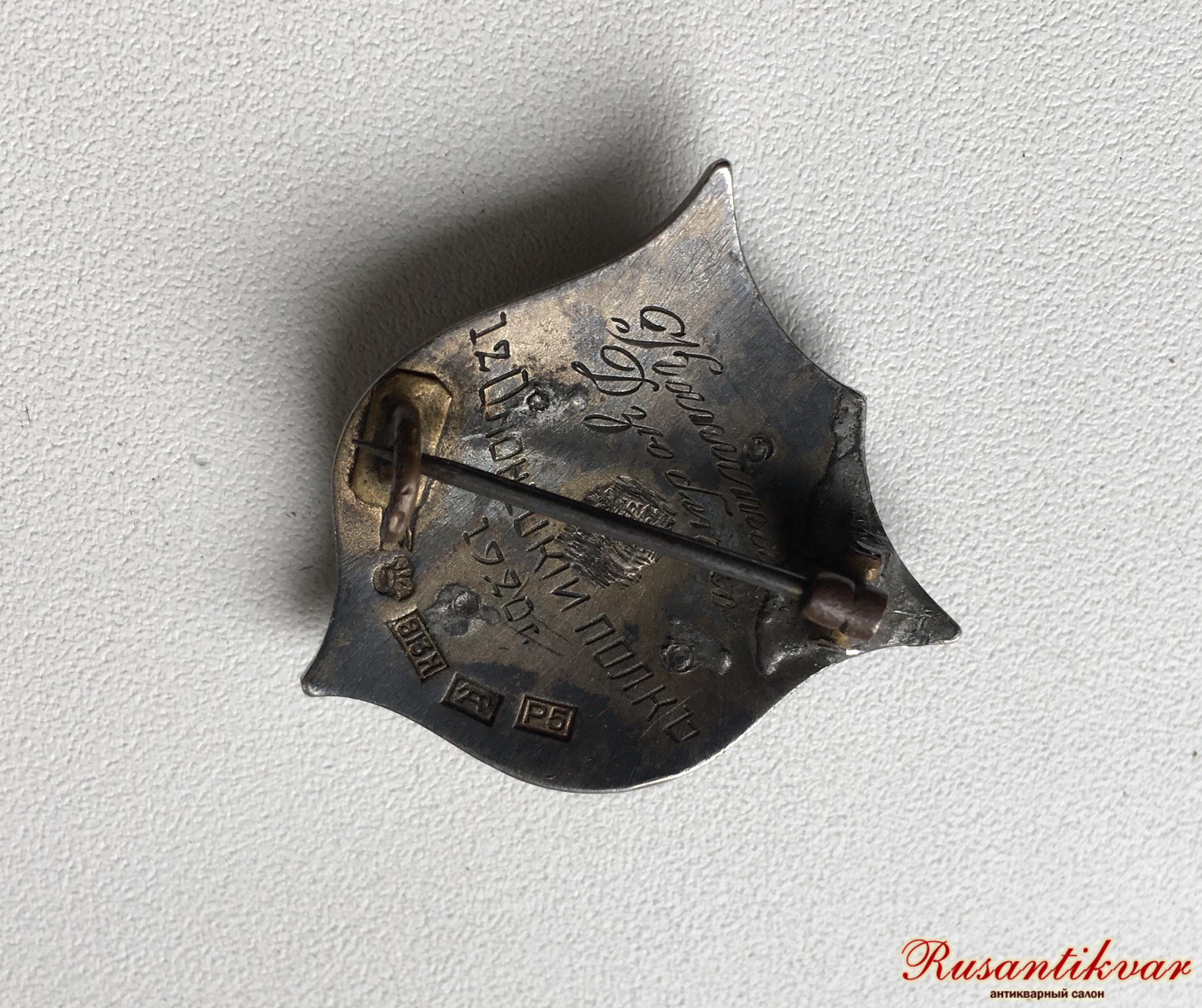 Знак 12-го Северного стрелкового Олонецкого полка. Финляндия, Або (Турку), 1920 г. Фирма «Kultateollisuus Ky». Клейма на об. ст. знака внизу: клеймо фирмы [крылатый молоток], клеймо для изделий, выполненных в Финляндии [корона], проба металла «813 H», городское клеймо Або (Турку) [древняя буква «А»] и годовое клеймо «P5» (1920 г.). Серебро, позолота, эмаль, 8,03 г. Размеры 27,2×22,8 мм. Оригинальное винтовое крепление переделано на булавку с застежкой. Принадлежал В.Н.Дзюбенко. Гравировка на об. ст. знака в четыре строки: «Капитанъ / Дзюбенко / 12 Олонецкiй полкъ / 1920 г.».Знак выставлялся 2018 году на аукционе"Монеты и Медали".В литературе по знакам "Белого движения" знак не описан.