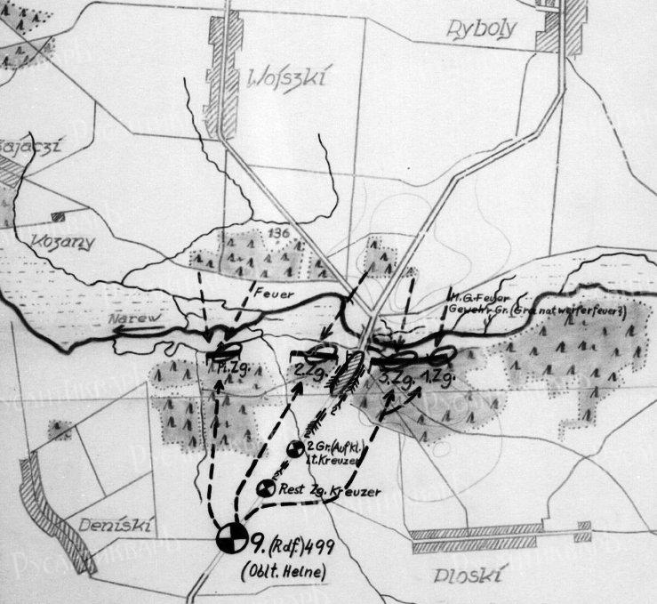 Прибыв в Храболы, передовой отряд полка остановился на короткий отдых, пока лейтенант Гайне получал от полковника Грайнера подробные указания по поводу дальнейших действий. В соответствии с приказом командира дивизии, 499-й пехотный полк, усиленный вторым дивизионом 43-го артиллерийского полка и третьей моторизованной ротой 268-го саперного батальона, захватив мост через Нарев, должен был занять Рыболы, а затем к концу дня, прорываясь через Давидовичи, должен был овладеть холмами близ деревни Тростяница . За атакующим полком должен был следовать 488-й пехотный полк полковника Кохлера, усиленный вторым дивизионом 268-го артиллерийского полка. Дислоцированный в лесу к западу от Малинова полк должен был передвигаться по маршруту: Малиново – Налоги – Столовач – Райск – Храболы. 268-й саперный батальон (без 3-й роты) получил задание сгруппироваться в районе Столовача и быть готовым при первой необходимости немедленно выдвинуться в район моста на Нареве. 268-й разведывательный батальон по-прежнему должен был оставаться в лесу в районе Столовача. В это время командование дивизии дислоцировалось на краю леса, расположенного в 250 м к юго-востоку от Малешей .