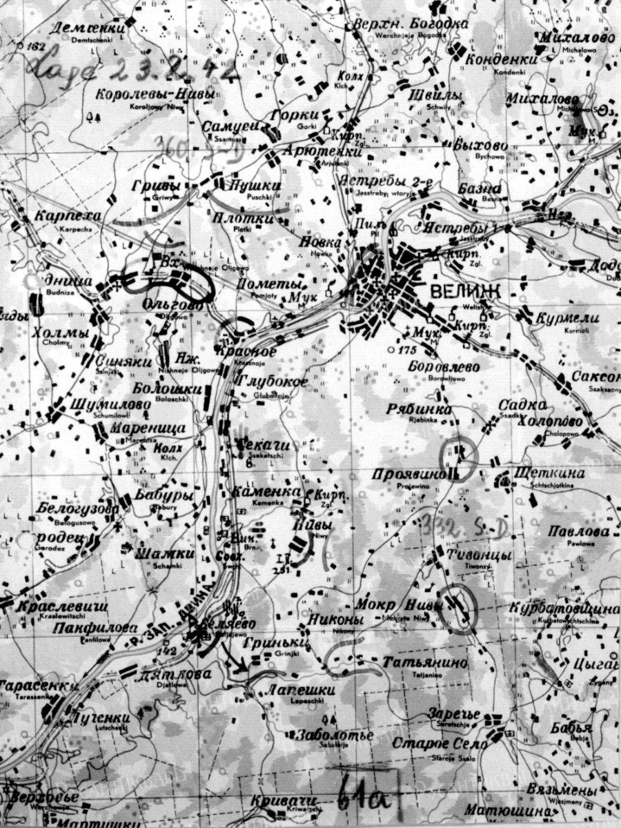 Так как оборона этого населенного пункта была затруднена из-за его расположения в низине с точки зрения рельефа местности, с целью выполнения задачи была проведена рекогносцировка позиций для обороны западнее НИЖНЕЕ ОЛЬГОВО. Однако разведка местности показала, что эта местность точно также не годится для обороны, так как она может просматриваться как из БУДНИЦА, так и из ВЕРХНЕЕ ОЛЬГОВО и населённых пунктов ГРИВЫ и ПУШКИ, расположенных севернее, и, исходя из этого, точно также быть объектом миномётного и артиллерийского огня врага. На основании этого соответствующее донесение было направлено в дивизию с просьбой о принятии решения».