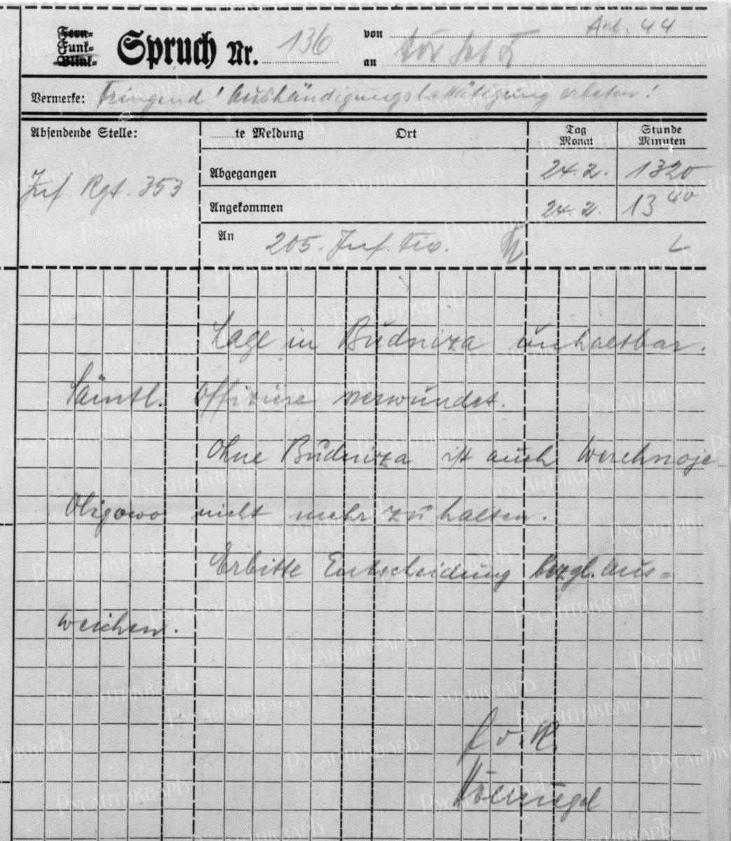 Со всех сторон окружены всё более усиливающимся противником. Имеющимися средствами на текущий момент я отступил перед мощным наступлением, которое я ожидал с северо-западного направления. Кроме этого, подвергнут огню на уничтожение со всех сторон из установленного тяжёлого оружия, не имея возможности оказать сопротивление. Вижу единственное решение, которое соответствует обстановке, становящейся всё более безнадежной, это только незамедлительное отступление через ВЕРХНЕЕ ОЛЬГОВО на КРАСНОЕ, чтобы там соединиться с дивизией. Прошу бомбардировщики для нанесения удара по вражеским позициям вокруг БУДНИЦА».