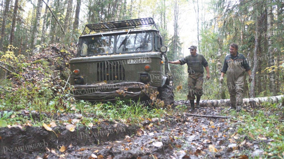 Пока ребята докапывают яму, решаем, всё-таки, налегке попробовать пробиться к перекрестку «Мерседес». Садимся в ГАЗ-66. Хюппенен пристроился «на броне» - на запасном колесе между кабиной и кузовом. Оттуда замечательный обзор. Главное, вовремя от веток и нависающих над дорогой стволов деревьев увернуться! На этот раз за штурмана в кабине Женя Ротарь. На левом рукаве свежепришитая нашивка с ярко - красной звездой и надписью «Северо-Запад». Он недавно влился в наши ряды. Увлекался поиском монеток на старых урочищах. Но посетив наш поисковый музей «Военной археологии» у стадиона «Петровский» стал вместе с нами ездить на поисковые работы. 66-й натужно ревет двигателем, вращая огромные колеса, облепленные глиной так, что не видно никаких протекторов. Попытка ходом проскочить очередную лужу кончается оторванным правым зеркалом и мощной вмятиной на двери. Но боевые шрамы только украшают этот военный автомобиль. Выбираемся из грязи на лебёдке.