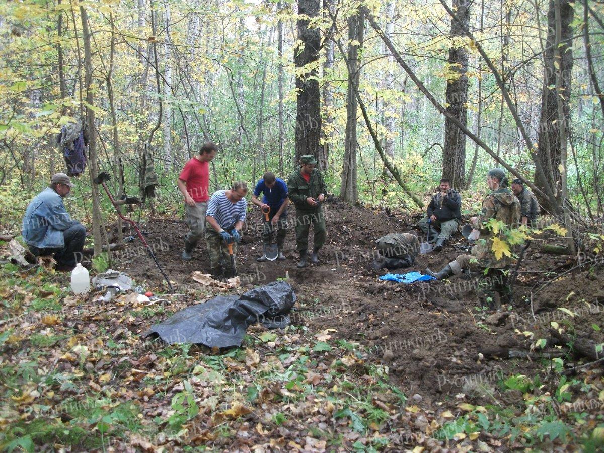 С утра после завтрака продолжаем добирать яму. Все старательно фотографируют процесс археологической зачистки останков солдат. На дне ямы отчетливо видны веточки лапника. Значит это не случайные погибшие, а санитарное захоронение. Видимо, с минимальными, но всё-таки почестями. Оборачиваемся на звук дизельного двигателя. О-О-О! Дима! Дима Воронов из нашего объединения, командир отряда «Лодва». Собственной персоной. Он передвигается по этим непроезжим местам на специально переделанном джипе Дефендер. Лебёдка. В кабине плоский, огромный, защищенный от вибрации и влаги навигационный компьютер. Портальные мосты от «Лапландера». Подкачка колес. Шины «Боггер» с прореженным протектором. Эти мудреные термины как пароль для джиповедов - любителей бездорожья. В переводе это значит «серьёзный внедорожный автомобиль». Здороваемся с коллегой. У Димы вытягивается лицо: «Я же по этой яме с прибором два раза проходил! Как нашли? На щуп натыкали?» Сыплются профессиональные вопросы. Ну, вы даете! Молодцы! – уважительно говорит Дима. Желает удачи и с басовитым дизельным рыком отбывает по своему маршруту.