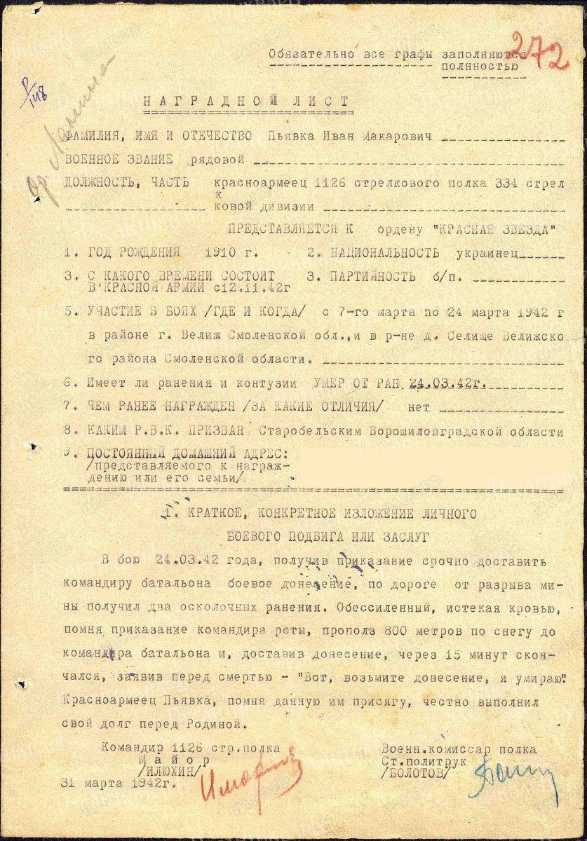 Иван Макарович Пьявка родился в 1910 году в селе Федоровка Карловского района Полтавской области. Служил в 1126-м сп 334-й сд, по национальности украинец, беспартийный. В рядах Красной Армии с 12 ноября 1941 года, призывался Старобельским РВК Ворошиловоградской области Украинской ССР. Участвовал в боях с 7 марта 1942 г. в районе г. Велижа, д. Селище. Находчивый, смелый солдат. Такие, как он, никогда не струсят, не подведут товарищей по оружию.