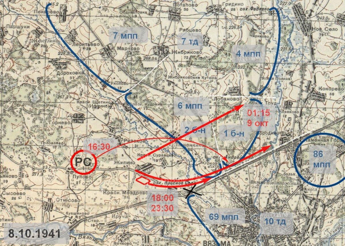 Оказалось, что дивизии 7-го ак вышли на автомагистраль ранее 87-й пд и, перейдя ее, достигли реки Вязьмы. Произошло это во второй половине дня 10 октября, а на 24:00 9 октября части 7-го ак находились еще в 12 км южнее р. Вязьмы.