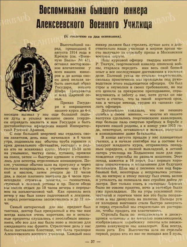 "Наш курсовой офицер гвардии капитан Г. Р. Ткачук, Георгиевский Кавалер японской войны, старался передать нам весь свой боевой опыт и все последующие достижения в военном деле. Полевой устав не столько теоретически, сколько практически мы проходили под руководством этого выдающегося офицера. Он был строг и неумолим в своих требованиях, но мы его ценили за прекрасное преподавание, справедливость и заботу о нас, хотя ругал он нас часто и считал, что за такой короткий срок, как в четыре месяца, трудно из «шпака» сделать офицера".