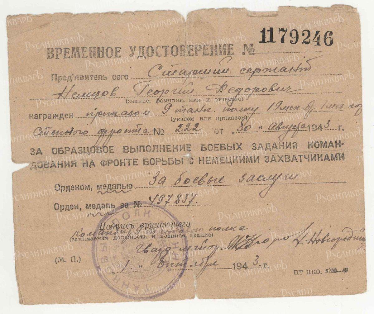 Временное удостоверение награжденного медалью "За боевые заслуги" от 1 октября 1941 года.