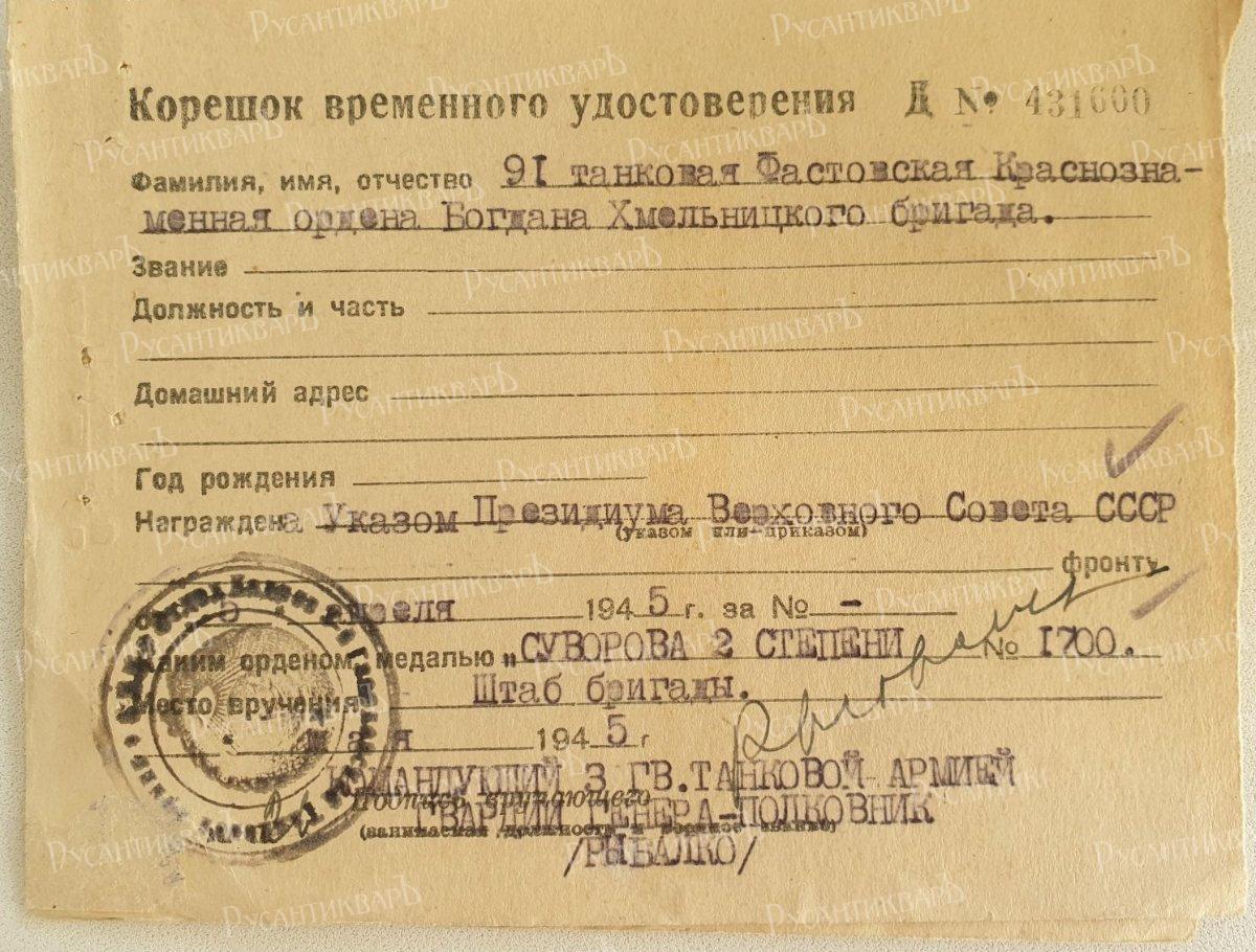 Временное удостоверения На танковую бригаду.