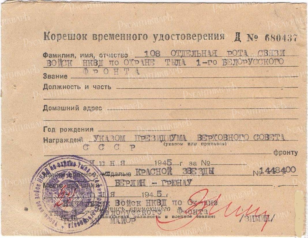 Временное удостоверения на отдельную роту связи ВОЙСК НКВД.