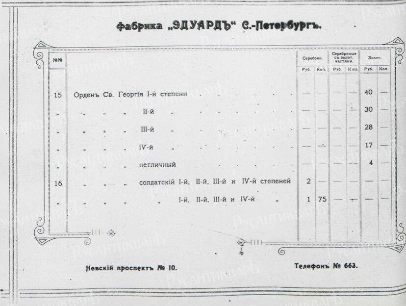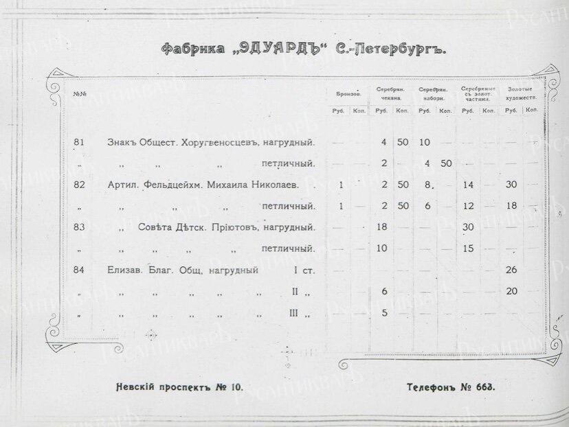 Прейскурант цен на ордена Российской Империи фирмы "Эдуард".
