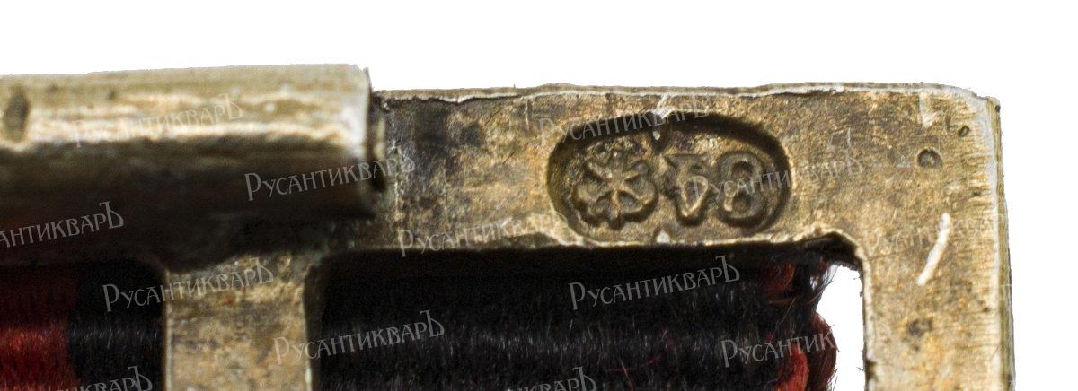С.-Петербург, 1855 г. Фирма «Кейбель». Клейма: на об. ст. знака внизу справа от застежки — городское клеймо С.-Петербурга с датой «1855», слева — именное клеймо «WK»; на лиц. ст. знака внизу на банте — проба металла «84». Серебро, позолота, шелк. Размеры 28,4×33,0 мм. Сохранность очень хорошая. Патрикеев, Бойнович.2# 12.1.а. Утвержден 22 августа 1827 г. Редкий.