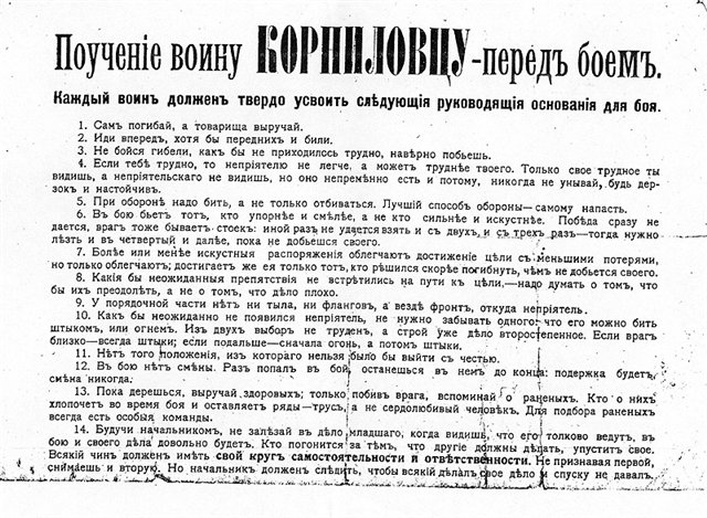 Корниловский ударный полк и запасной батальон его комплектовать исключительно из добровольцев тыла, запасных частей и частей, не входящих в состав корпусов (последних, с согласия их начальников).