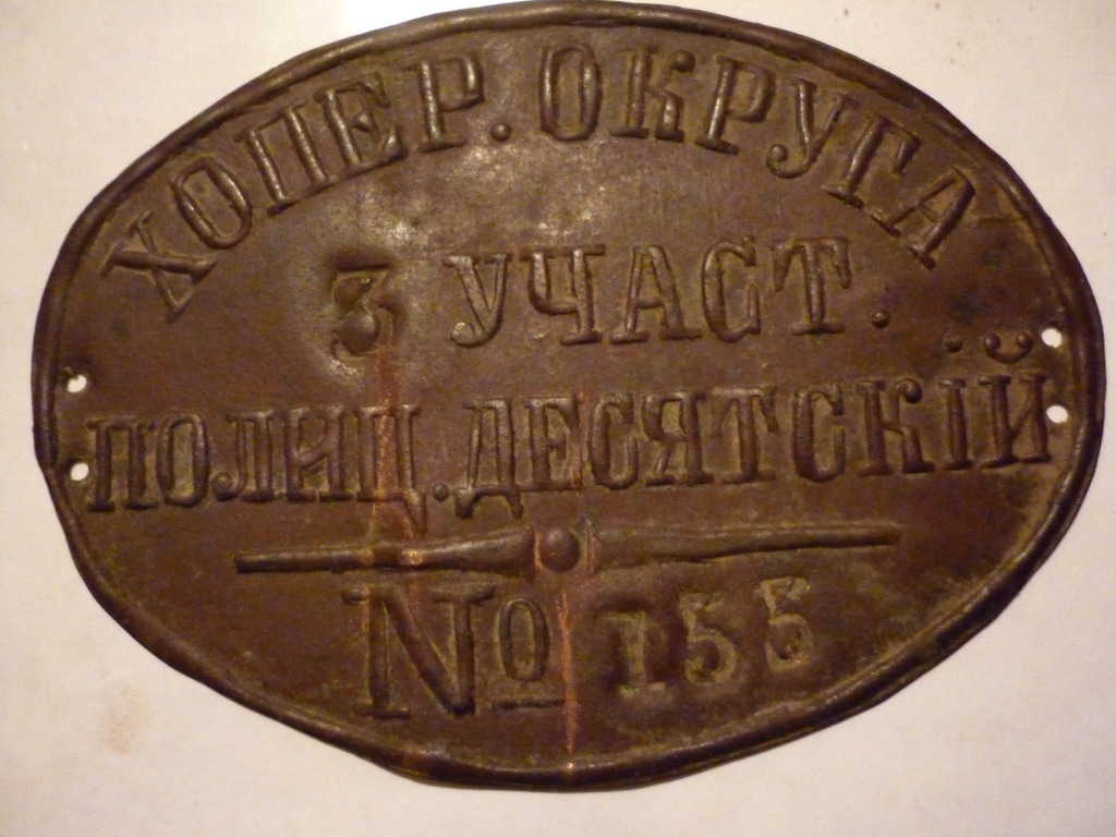 Должностные знаки; Полицейский десятский 3го и 4го участков Хопёрского округа О.В.Д.; Полицейский десятский Донецкого округа О.В.Д.