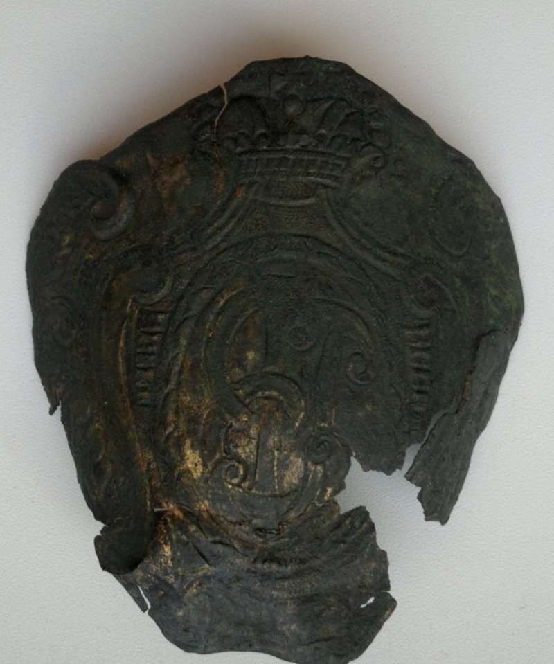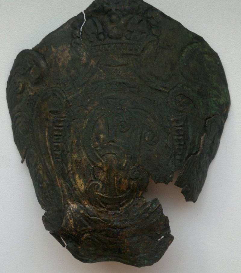 Очень важен размер вещи. На первый взгляд - центральная бляха с гренадерской или патронной сумы полков не имеющих собственных гербов (или гренадерских) времён правления Елизаветы Петровны. Если золочёная, то офицерская с гренадерской сумы. Недавно одному копателю повезло, и он нашёл очень похожий комплект (бляха с похожим изображением и две гренадки) на гренадерскую суму. Но только литые и с креплением аж на винтах.