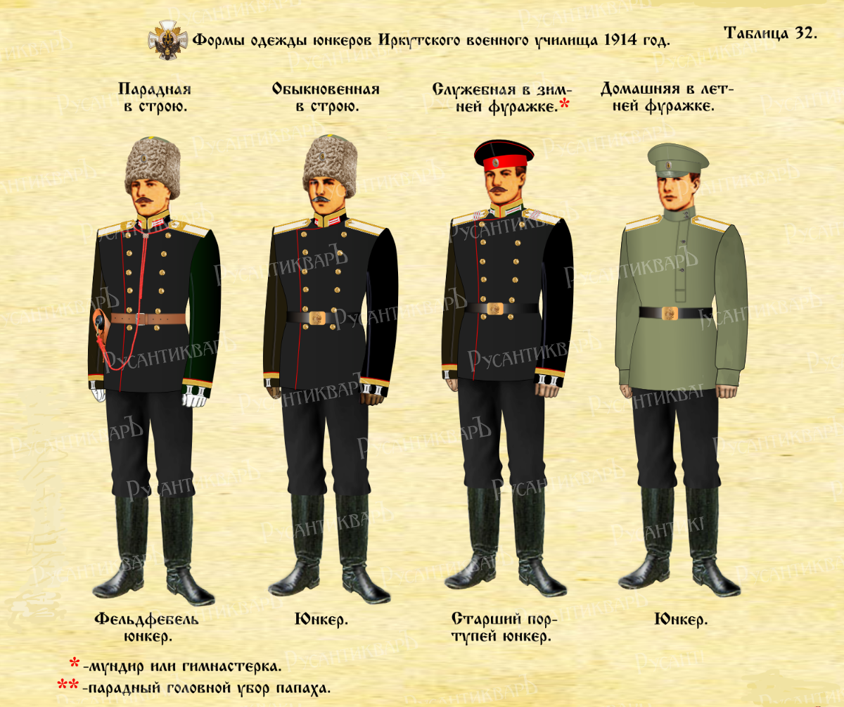 Форма одежды юнкеров. В 1909–1910 гг. произошло знаменательное событие. Юнкерам пехотных, специальных и пехотных юнкерских училищ был присвоен кивер гвардейского пехотного образца чёрного фетра, на котором спереди красовался герб военноучебных заведений - орёл с опущенными крыльями в сиянии.При парадной форме юнкера носили на кивере унтер-офицерский помпон. Исключение составляли лишь юнкера Иркутского военного училища,имеющие папаху.