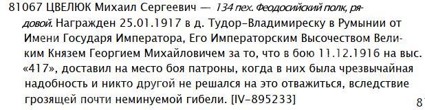 ГК 3 ст.№81067 ЦВЕЛЮК Михаил Сергеевич — 134 пех. Феодосийский полк, ря­