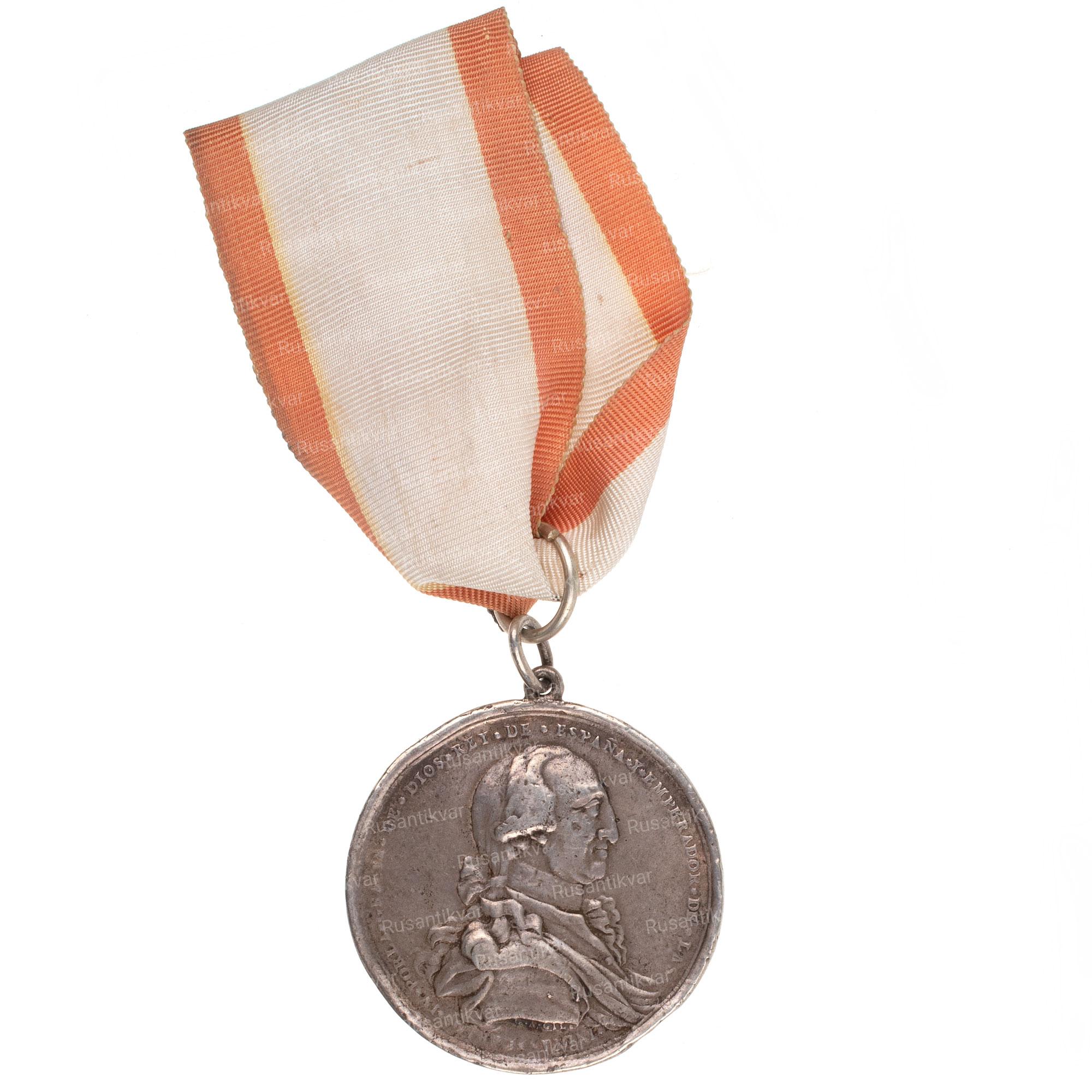 КАРЛ IV (1788-1808). Прокламация в консульстве Мексики. (Ae.32,36 г / 42 мм). 1789. Гравер: Г. (Вивес 147; RAH 418). Anv: бюст Карла IV в казаке, рубашке с чоррерой и мантии, вокруг легенда: Карл IV по милости Бога король Испании и императоры Индии. Rev: щит, увенчанный кувшином лилейников и пятью язвами Сан-Франциско, слева Меркурий, поддерживаемый петасо и кадуцеем, у его ног атрибуты науки, искусства и торговли, позади замок с башней и поднятым флагом, а справа-военный фрегат, вокруг легенда: к его провозглашению консульство Мексики, в экзерго: год 1789. Редкая медаль!